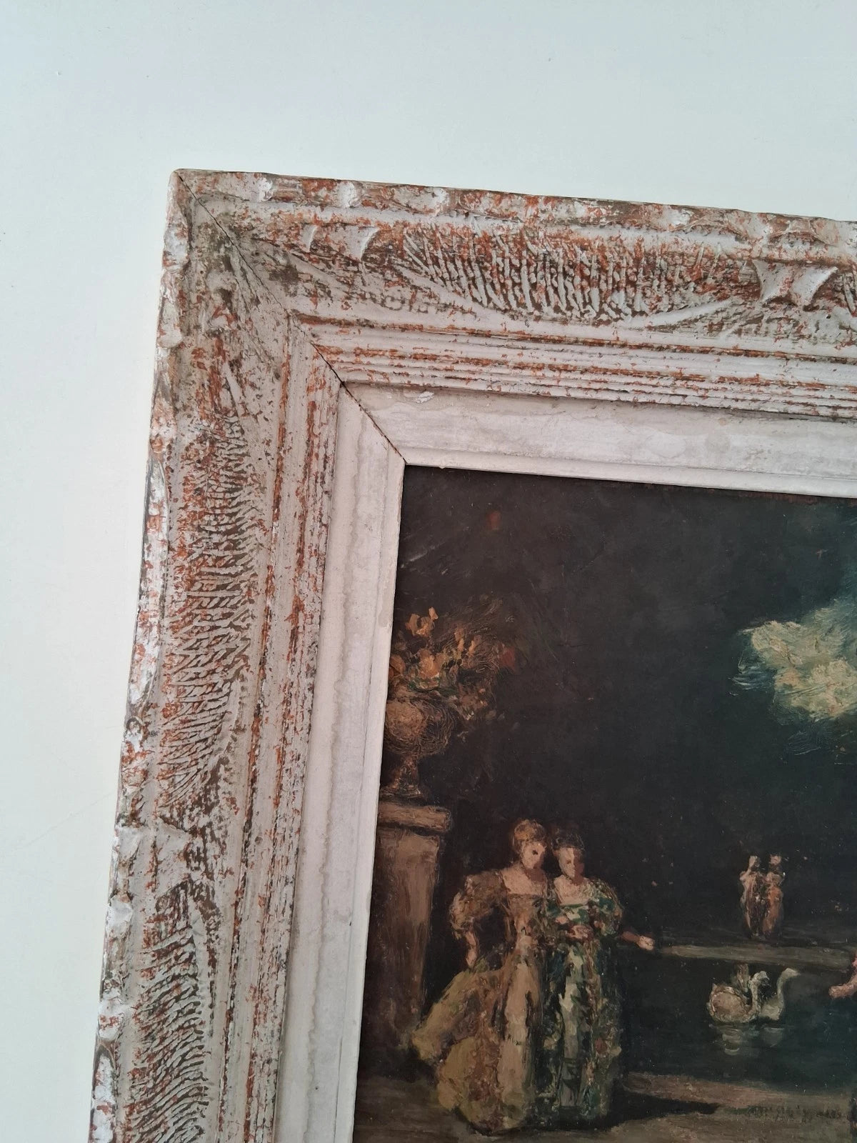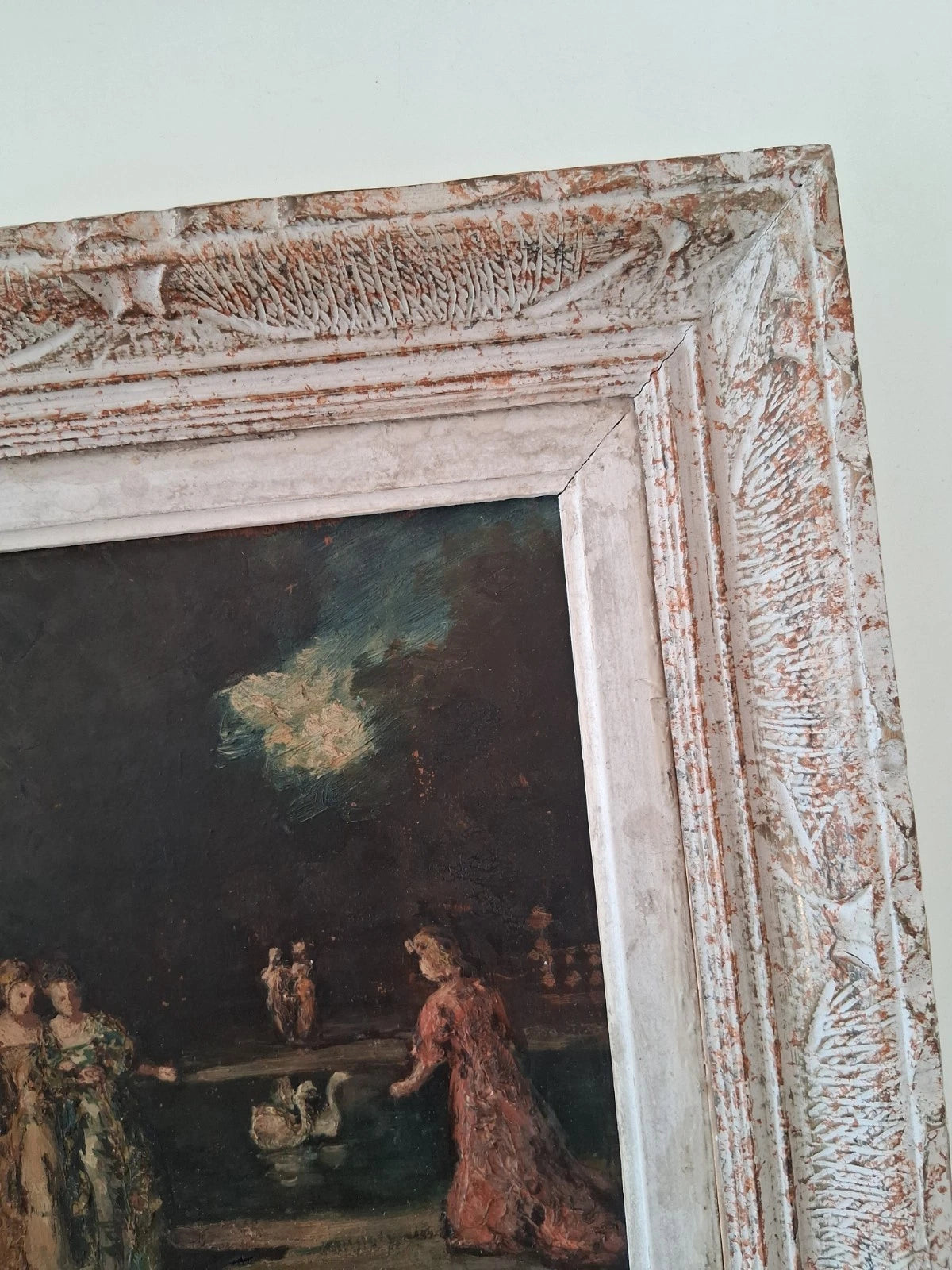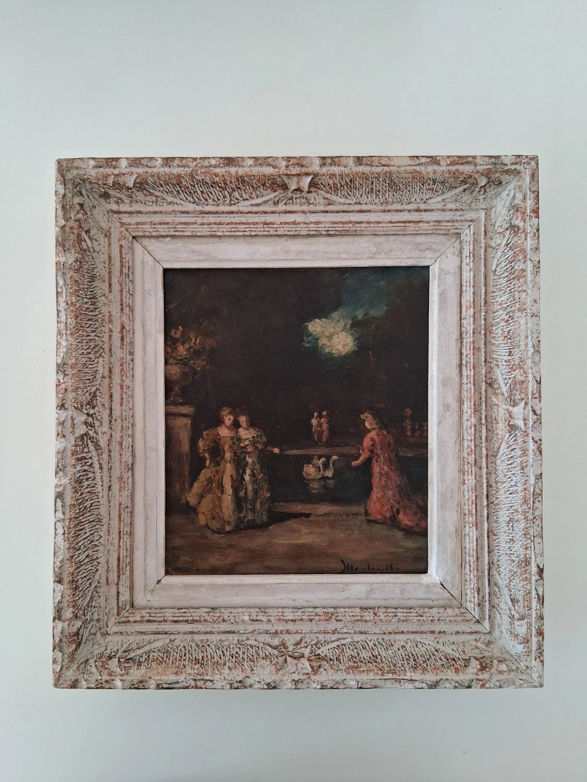 ORIGINAL Ölgemälde auf Holzplatte inkl. Rahmen, Motiv: Nächtlicher Garten mit Figuren in Barockkleidung und Schwänen, Signiert unten rechts: Adolphe Monticelli (1824-1886), Größen: ca. 34x37 cm (mit Rahmen) / ca. 20x23 cm (ohne Rahmen, sichtbarer Teil des Gemäldes), Zustandsbeschreibung siehe unten + Fotos - aus tierfreiem Nichtraucherhaushalt! Fotos sind Bestandteil des Angebots!