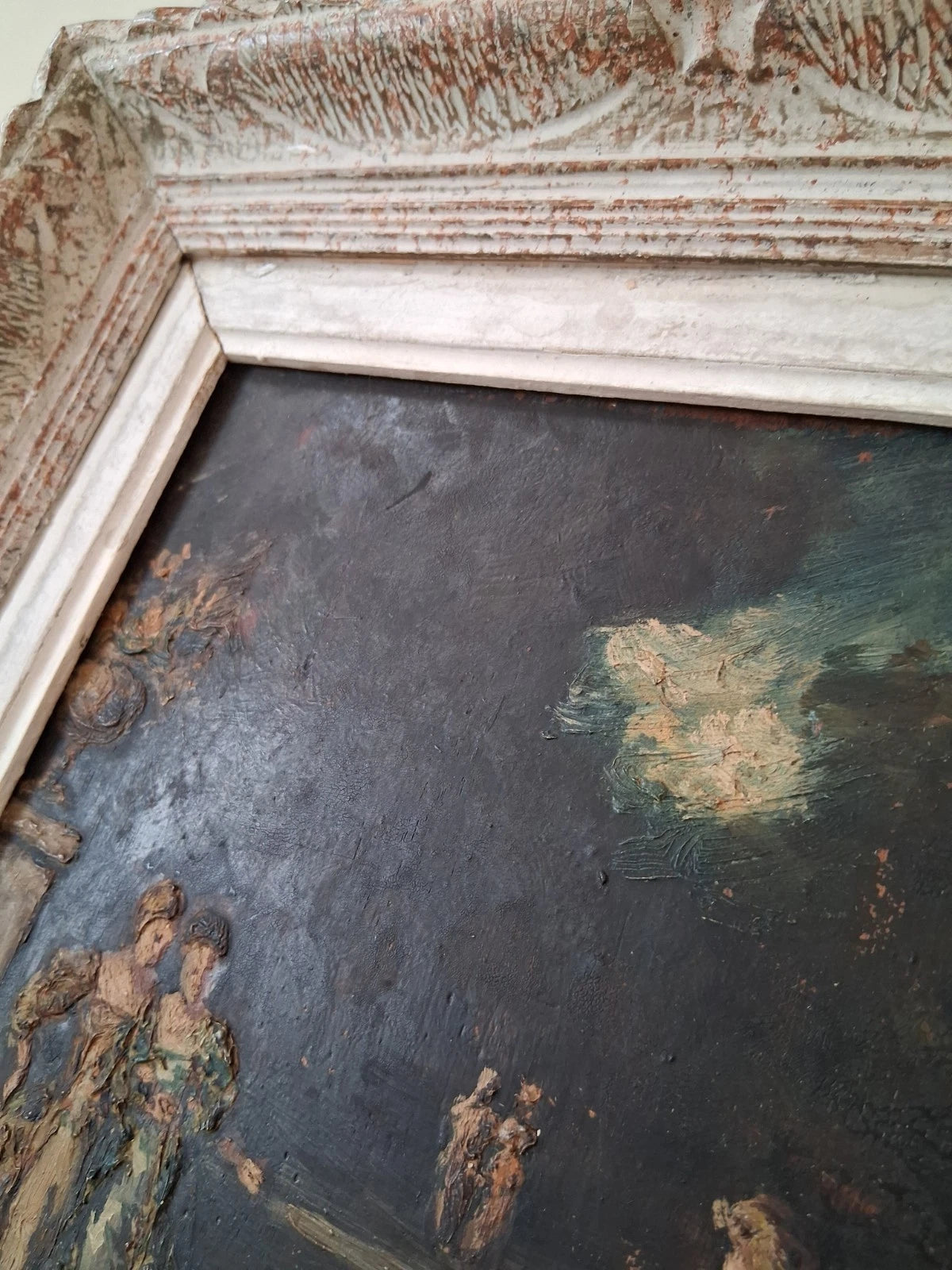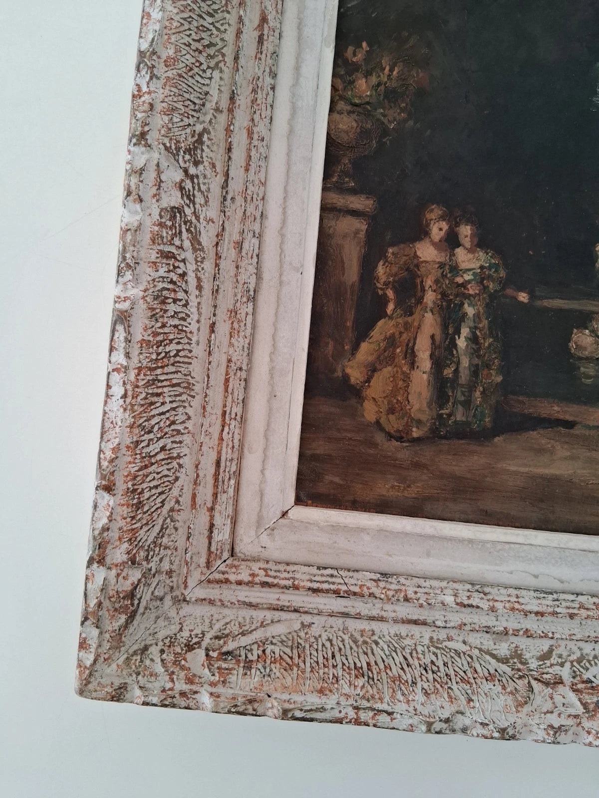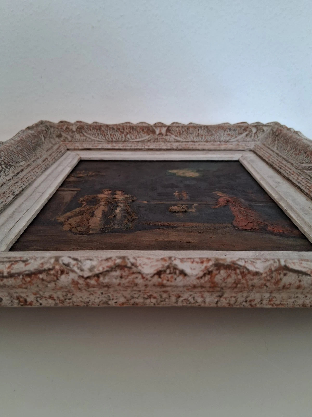 Das Gemälde ist dem Alter entsprechend in einem guten Zustand (siehe Fotos). Der antike Holzrahmen ist zwar sehr schön passend zum Gemälde, hat aber einige kleine Gebrauchsspuren, Risse und Abplatzer, die aus der Entfernung vielleicht nicht so auffallen. Zu empfehlen wäre dennoch ein Austausch des Rahmens!