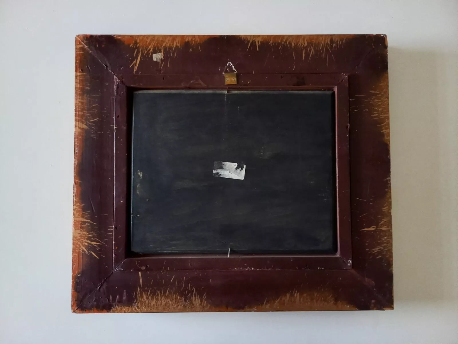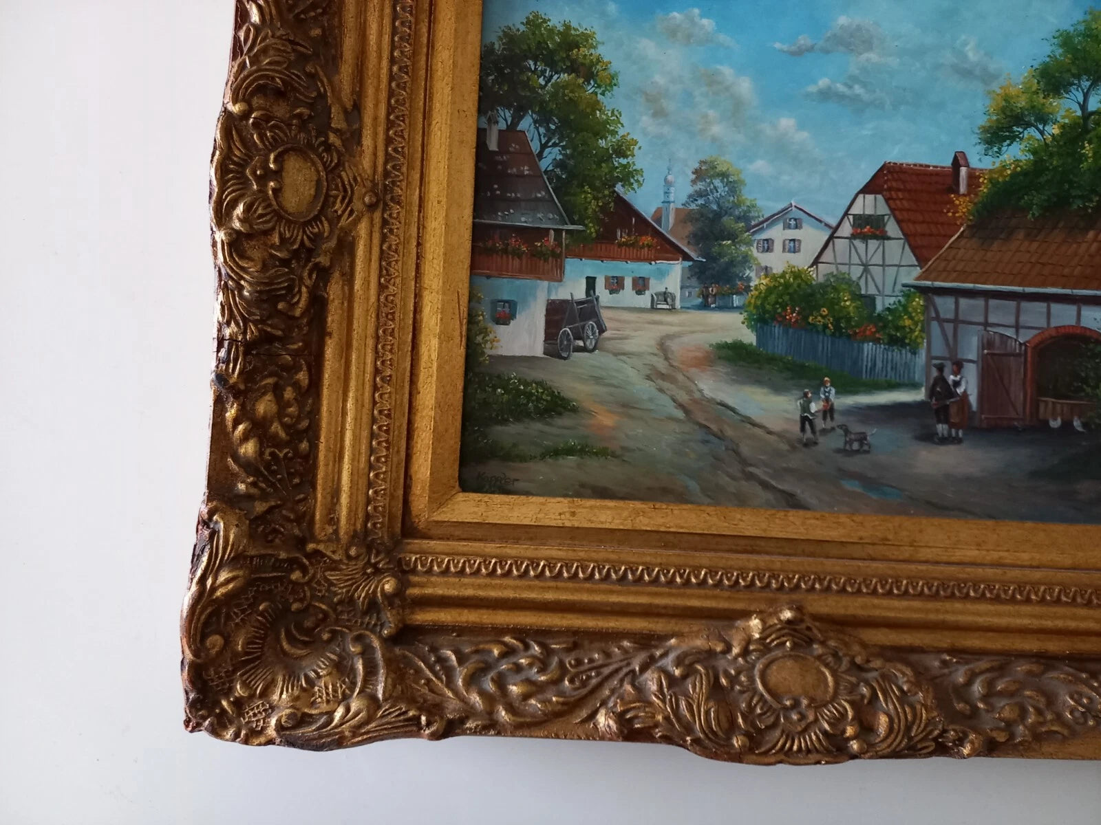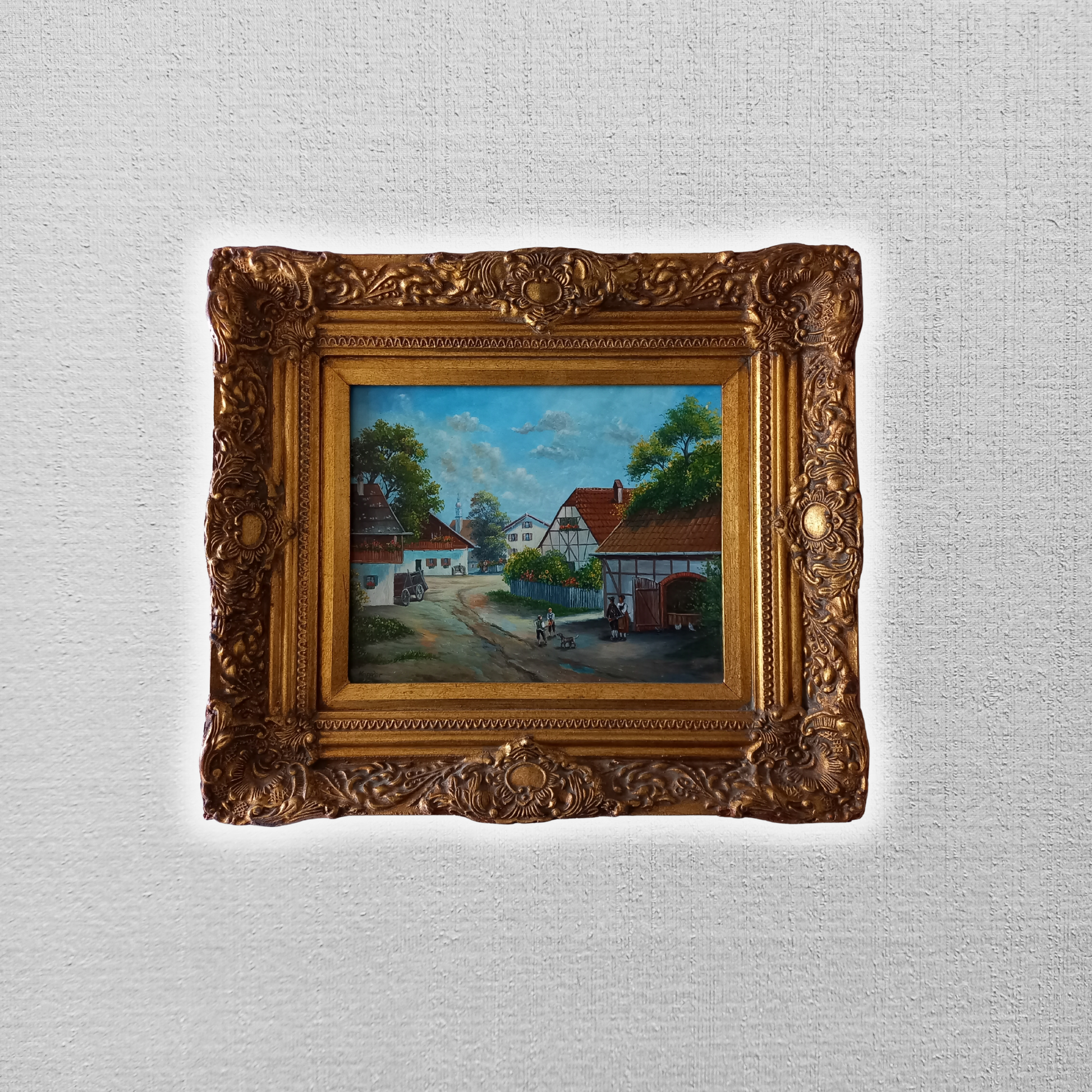 ORIGINAL Ölgemälde auf Holzplatte inkl. antikem Rahmen | Fachwerkhäuser / Dorfleben | Signiert