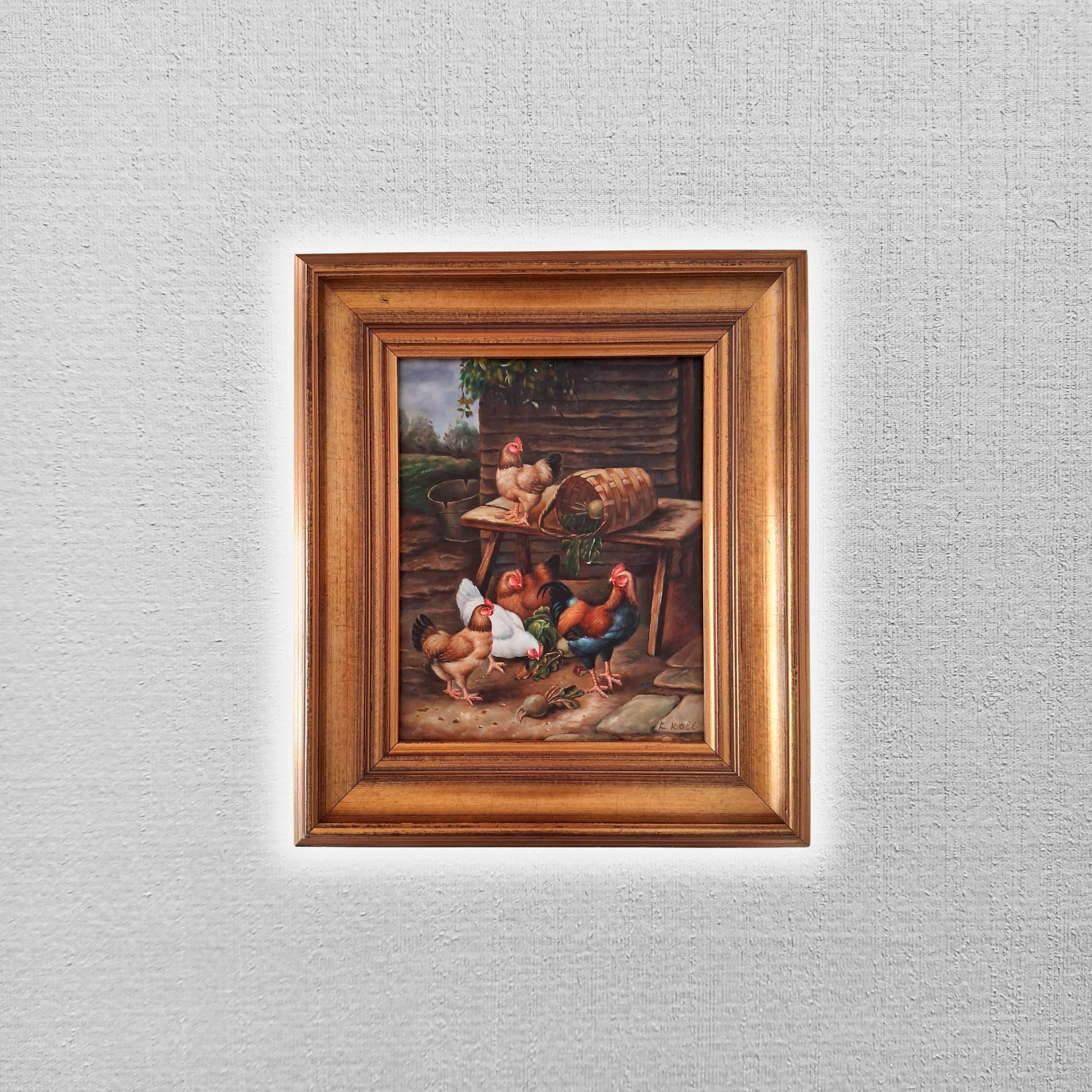 ORIGINAL Ölgemälde auf Holzplatte inkl. Rahmen | Hühnerstall / Bauernhof | Signiert: K. Koll