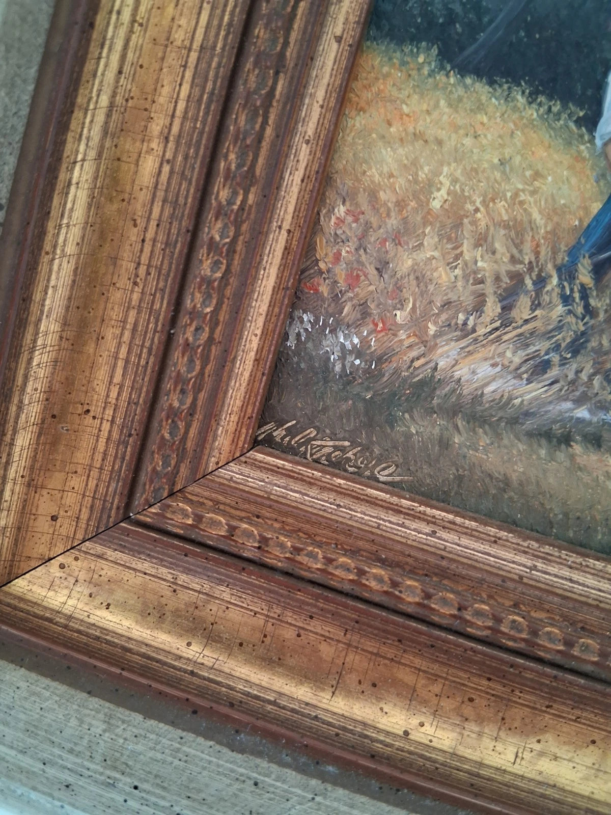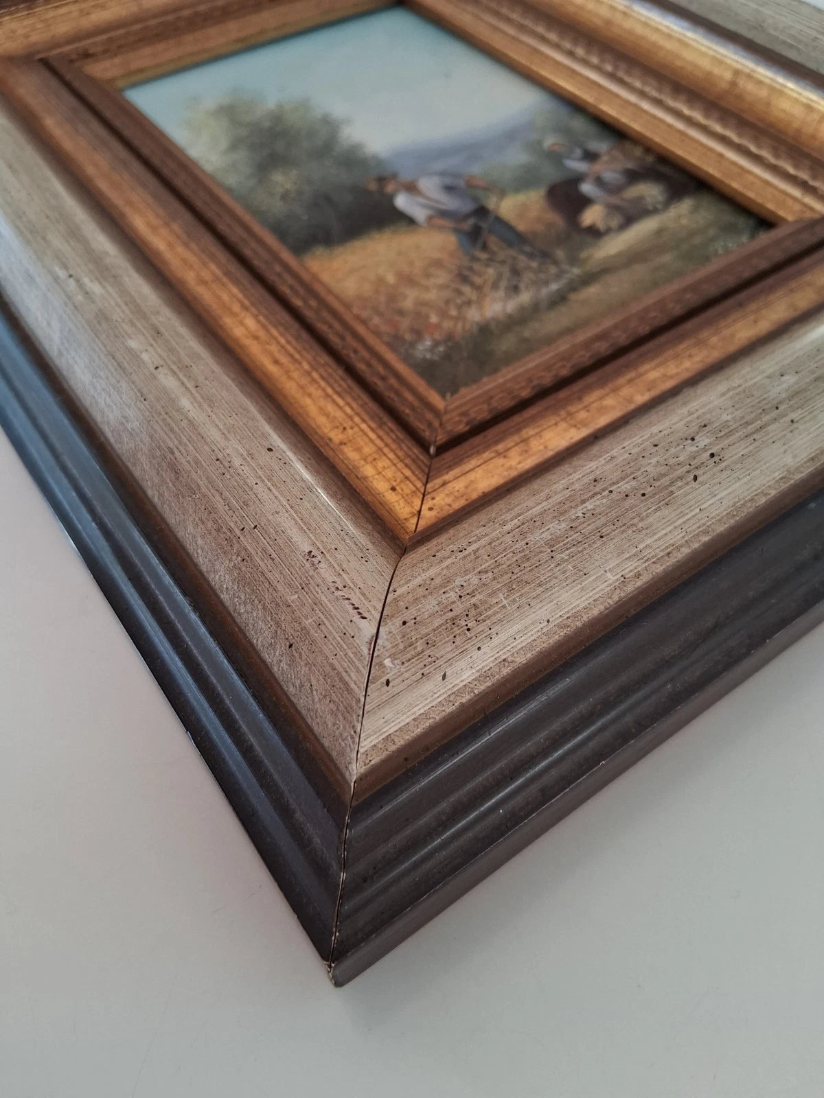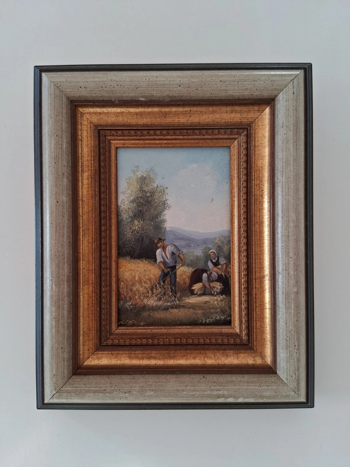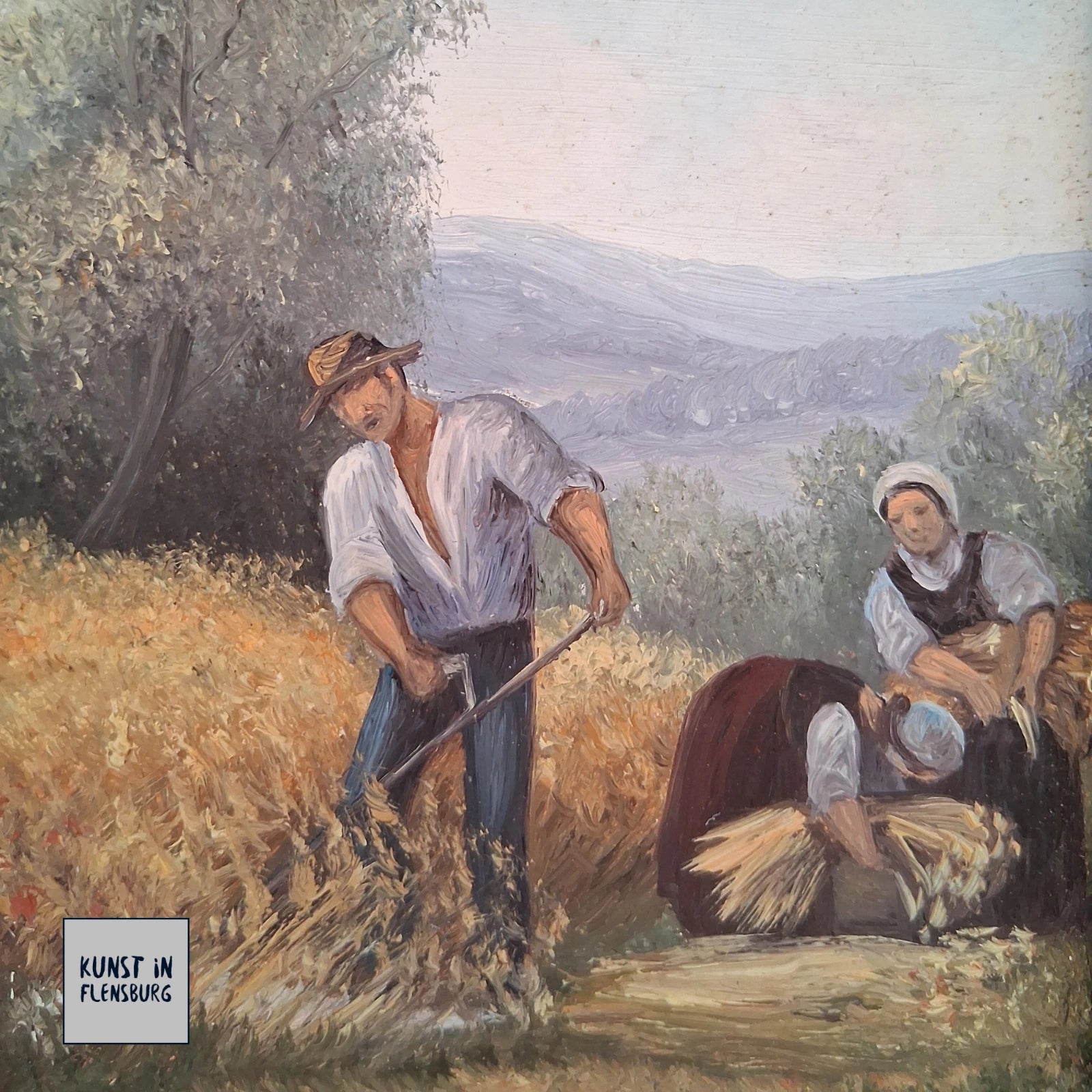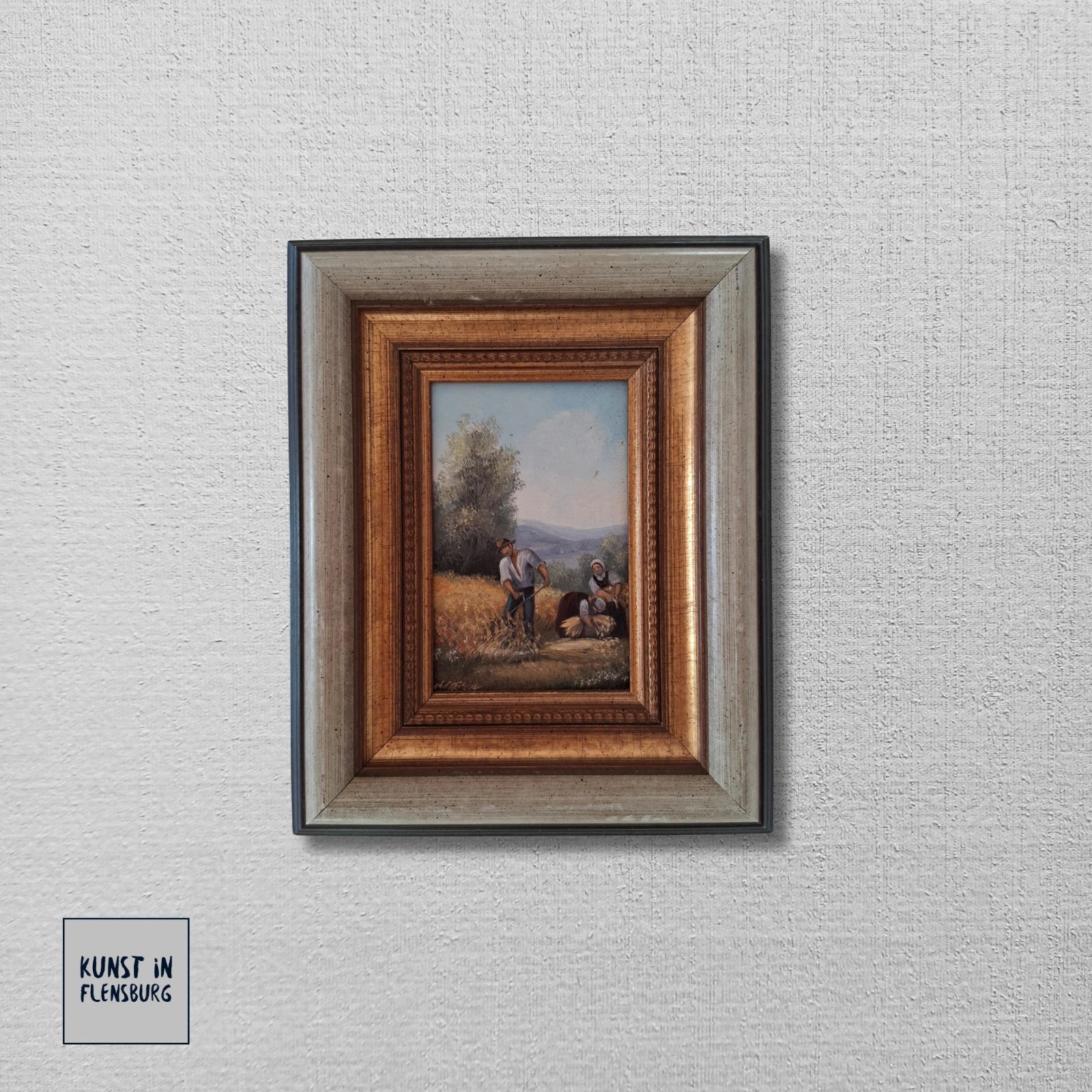 ORIGINAL Ölgemälde auf Holzplatte inkl. Holzrahmen, Motiv: Landwirtschaft/Heuernte/Figuren, Signiert unten links: (unleserlich), Größen: ca. 21,5x25,5 cm (mit Rahmen) / ca. 8,5x13 cm (ohne Rahmen, sichtbarer Teil des Gemäldes), Zustand dem Alter entsprechend -> Gebrauchsspuren am Rahmen (siehe Fotos) - aus tierfreiem Nichtraucherhaushalt! Fotos sind Bestandteil des Angebots!