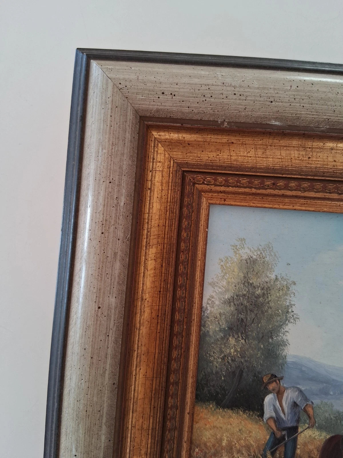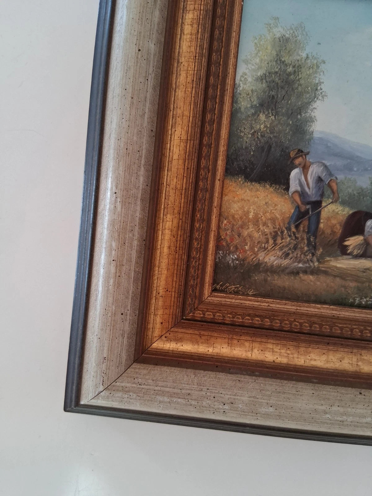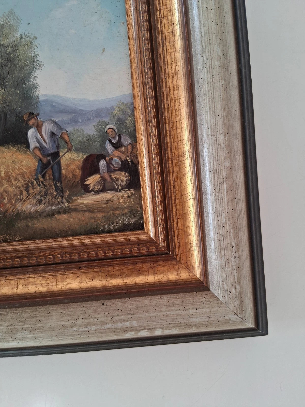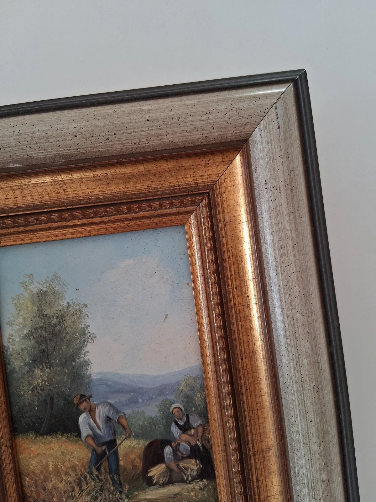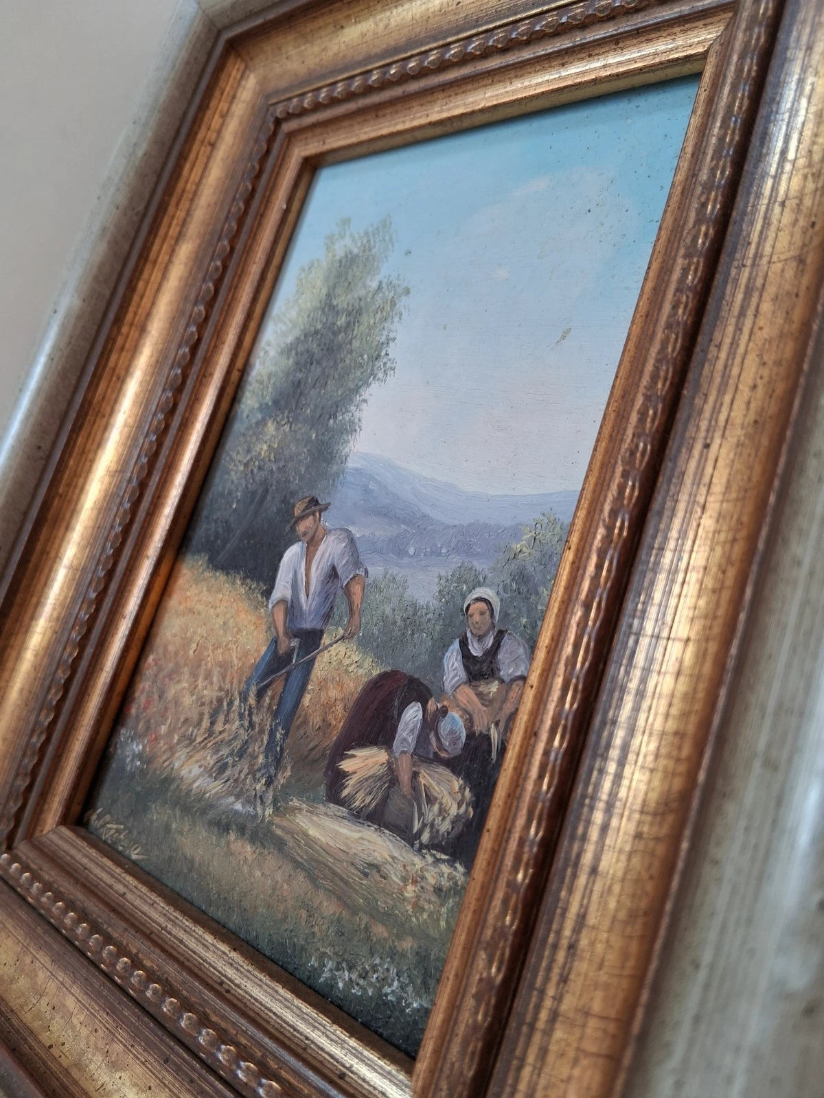 ORIGINAL Ölgemälde auf Holzplatte inkl. Rahmen | Landwirtschaft / Heuernte / Figuren | Signiert