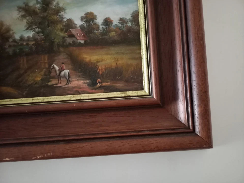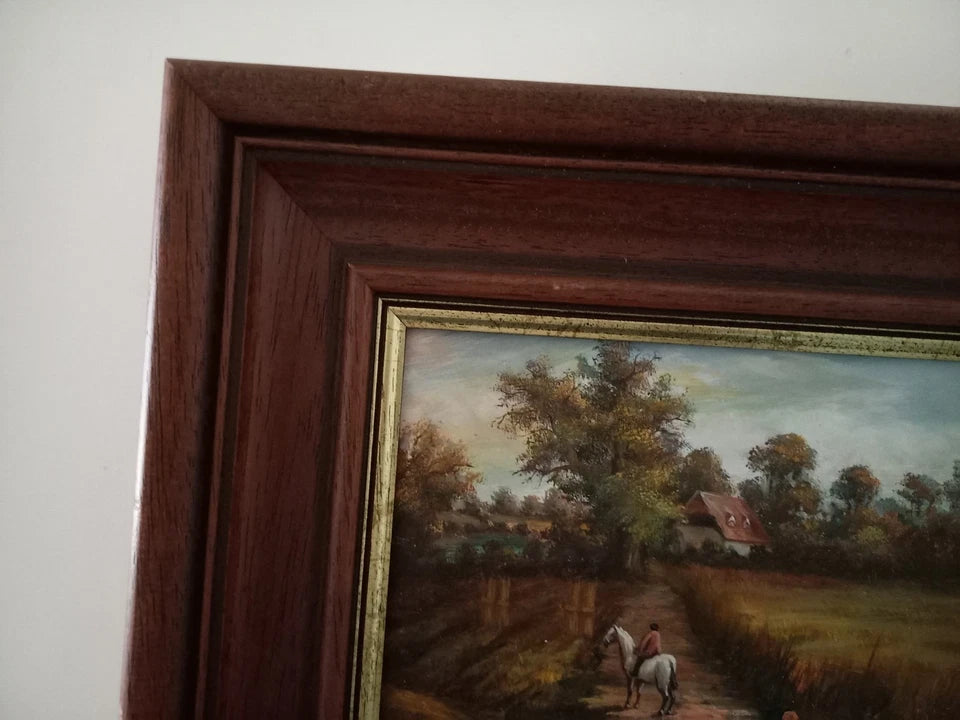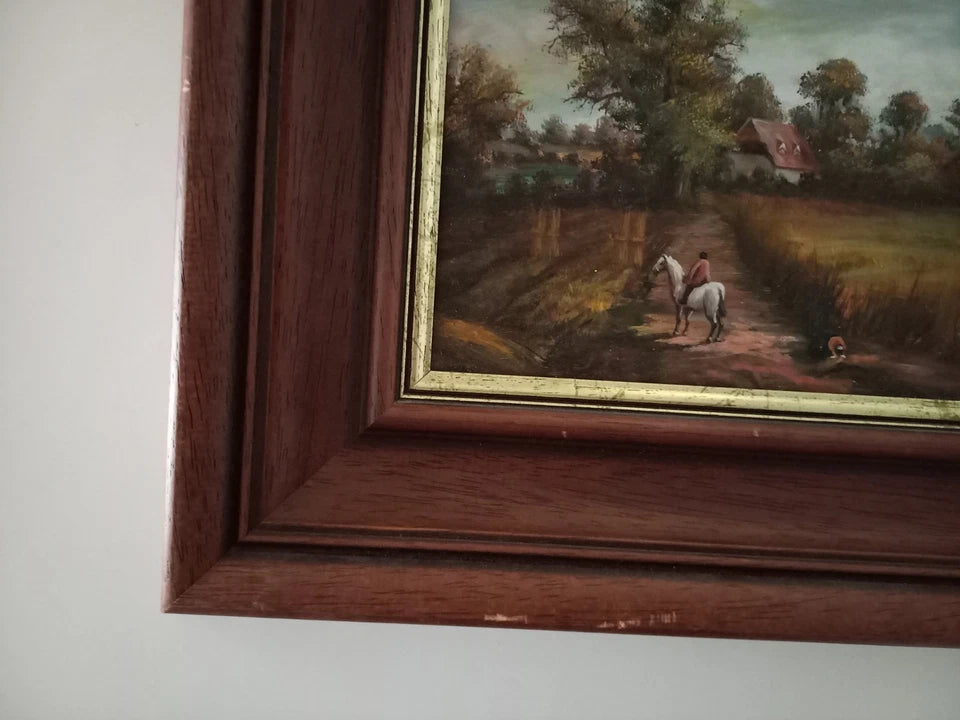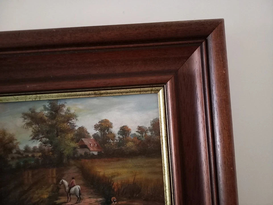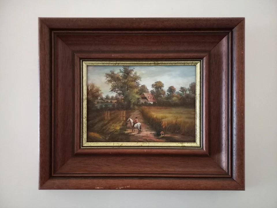 ORIGINAL Ölgemälde auf Holzplatte inkl. Rahmen | Reiter mit Pferd / Bauernhaus / Natur | 31x26 cm