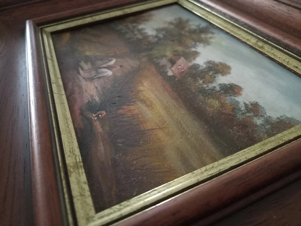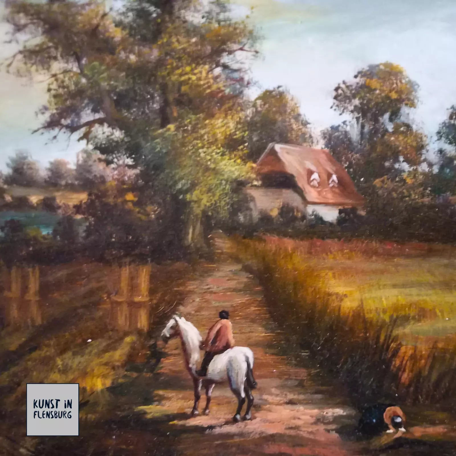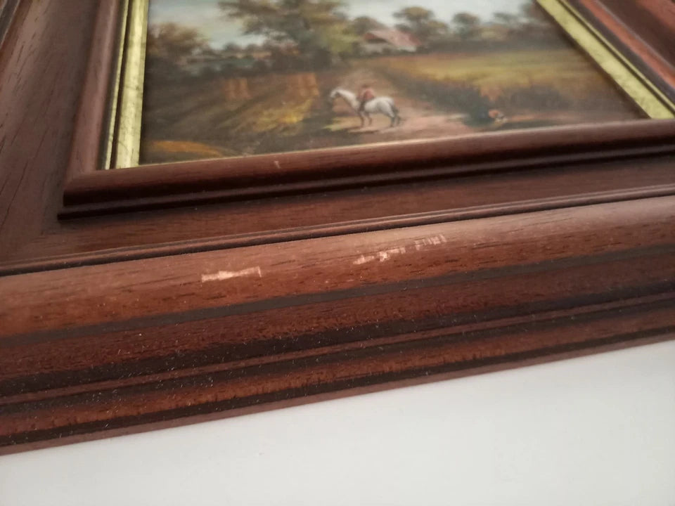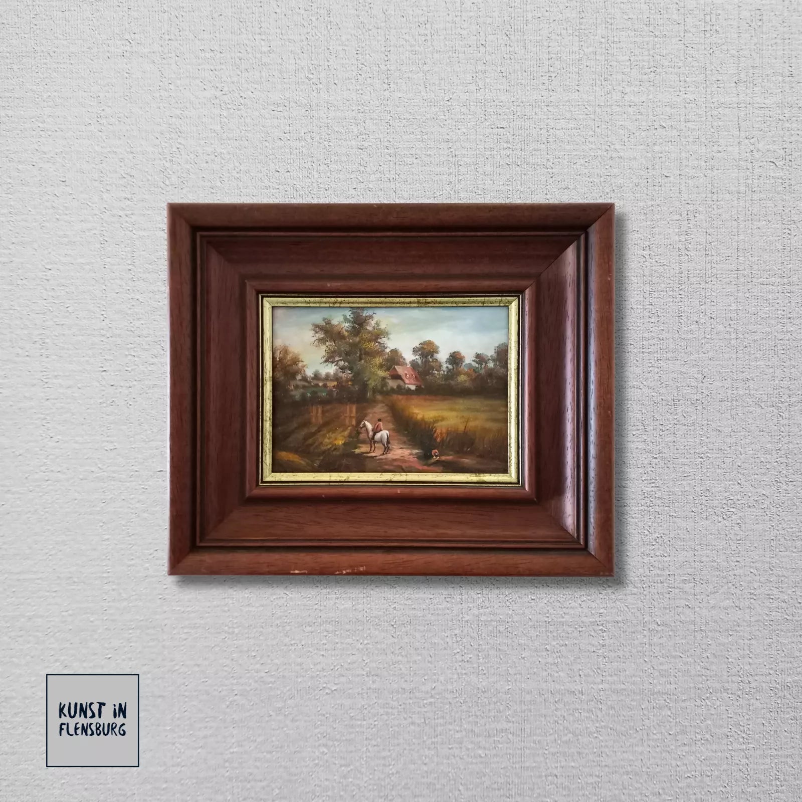 ORIGINAL Ölgemälde auf Holzplatte inkl. Rahmen | Reiter mit Pferd / Bauernhaus / Natur | 31x26 cm