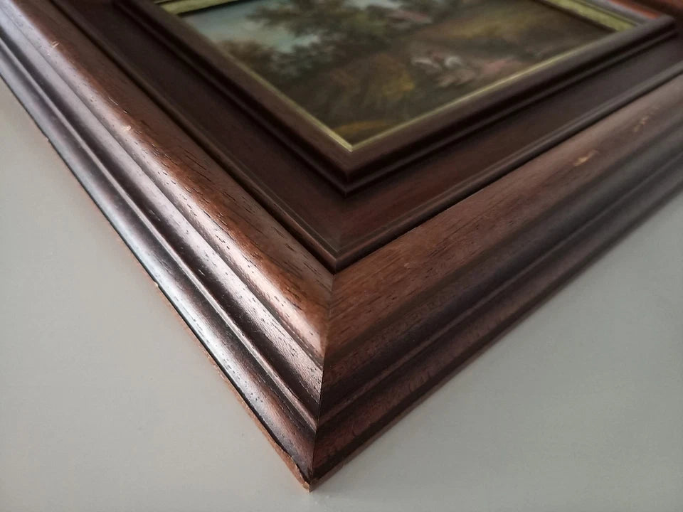 ORIGINAL Ölgemälde auf Holzplatte inkl. Holzrahmen, Motiv: Reiter mit Pferd vor dem Bauernhaus, Ohne Signatur, Größen: ca. 31x26 cm (mit Rahmen) / ca. 16,5x11,5 cm (ohne Rahmen, sichtbarer Teil des Gemäldes), Zustand dem Alter entsprechend (Gebrauchsspuren am Rahmen -> siehe Fotos) - aus tierfreiem Nichtraucherhaushalt! Fotos sind Bestandteil des Angebots!