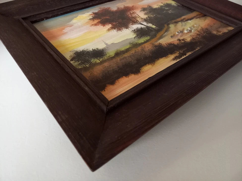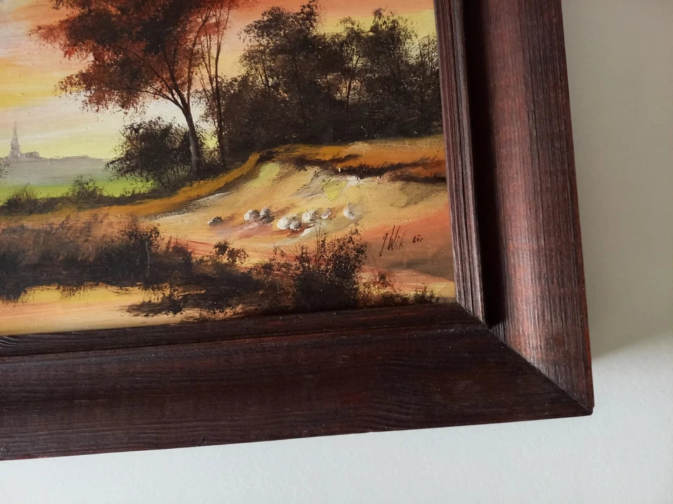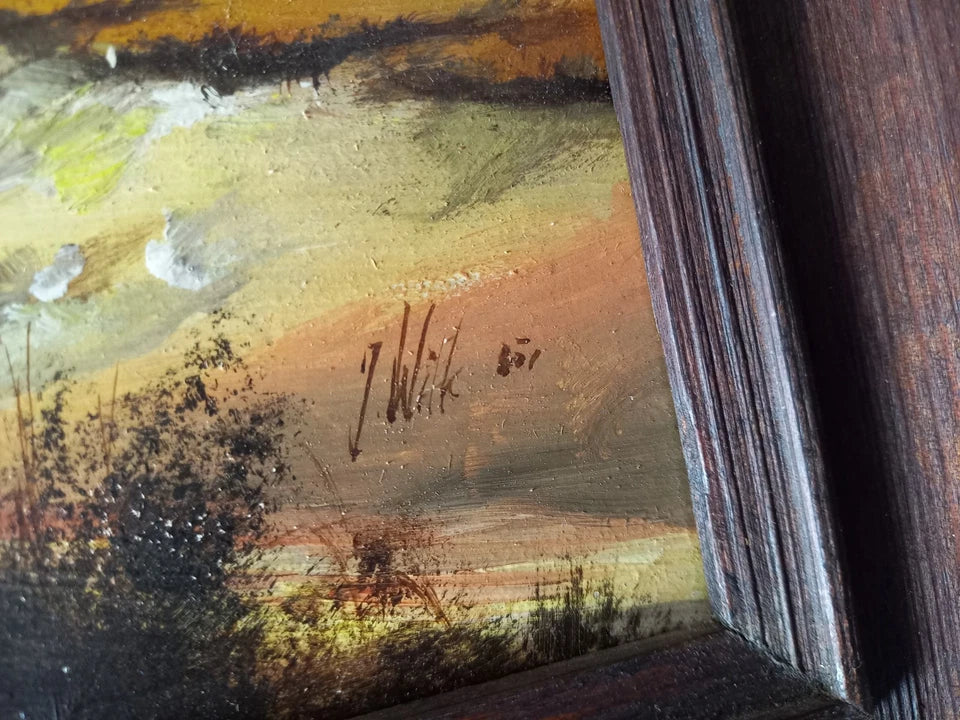 ORIGINAL Ölgemälde auf Holzplatte inkl. Rahmen, Motiv: Romantische Landschaft, Signiert unten rechts: J. Wilk (1872-1948), Größen: ca. 34x27 cm (mit Rahmen) / ca. 23,5x18 cm (ohne Rahmen, sichtbarer Teil des Gemäldes), Zustand dem Alter entsprechend (siehe Fotos) - aus tierfreiem Nichtraucherhaushalt! Fotos sind Bestandteil des Angebots!