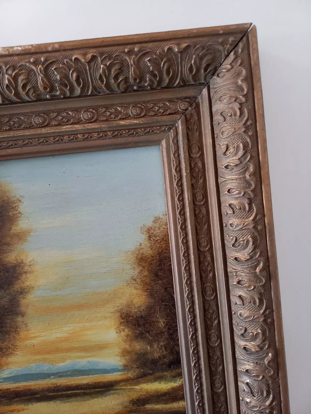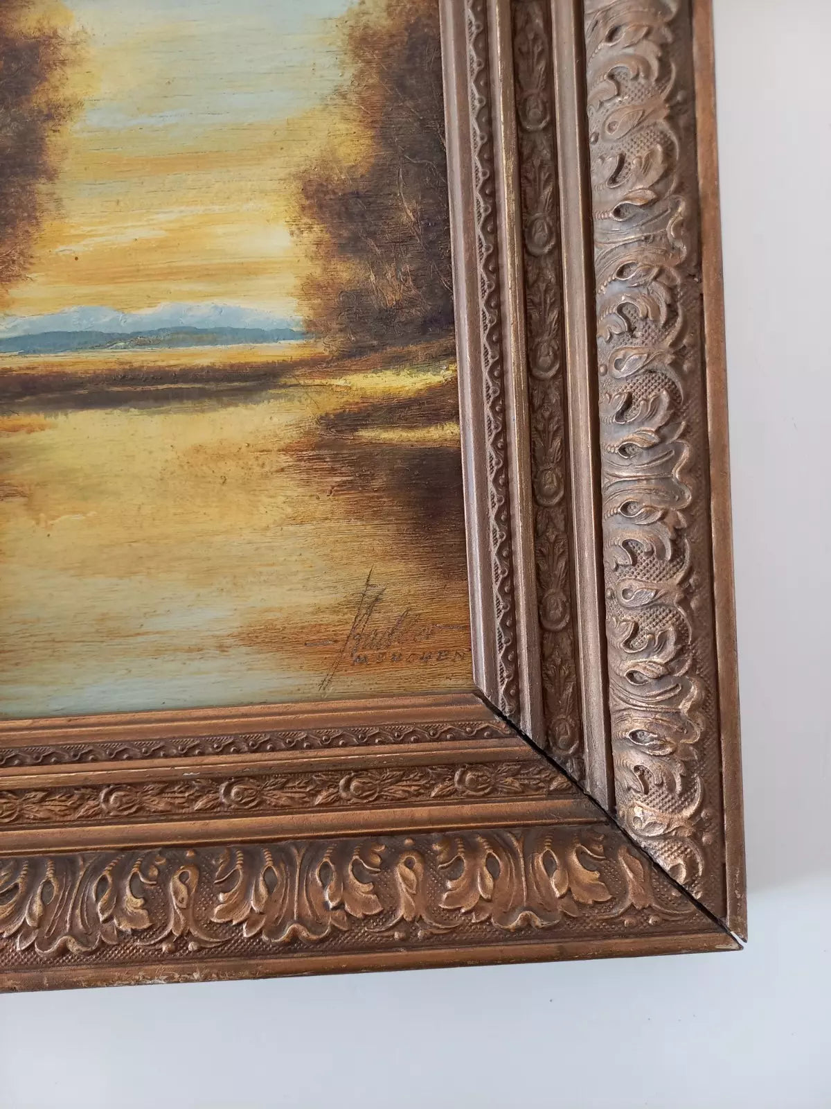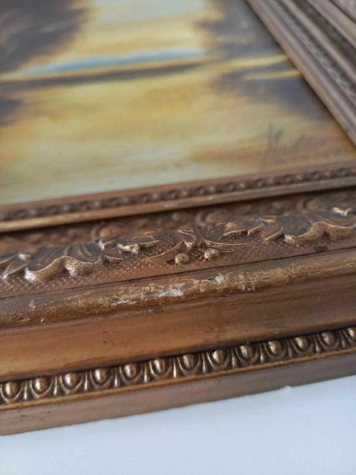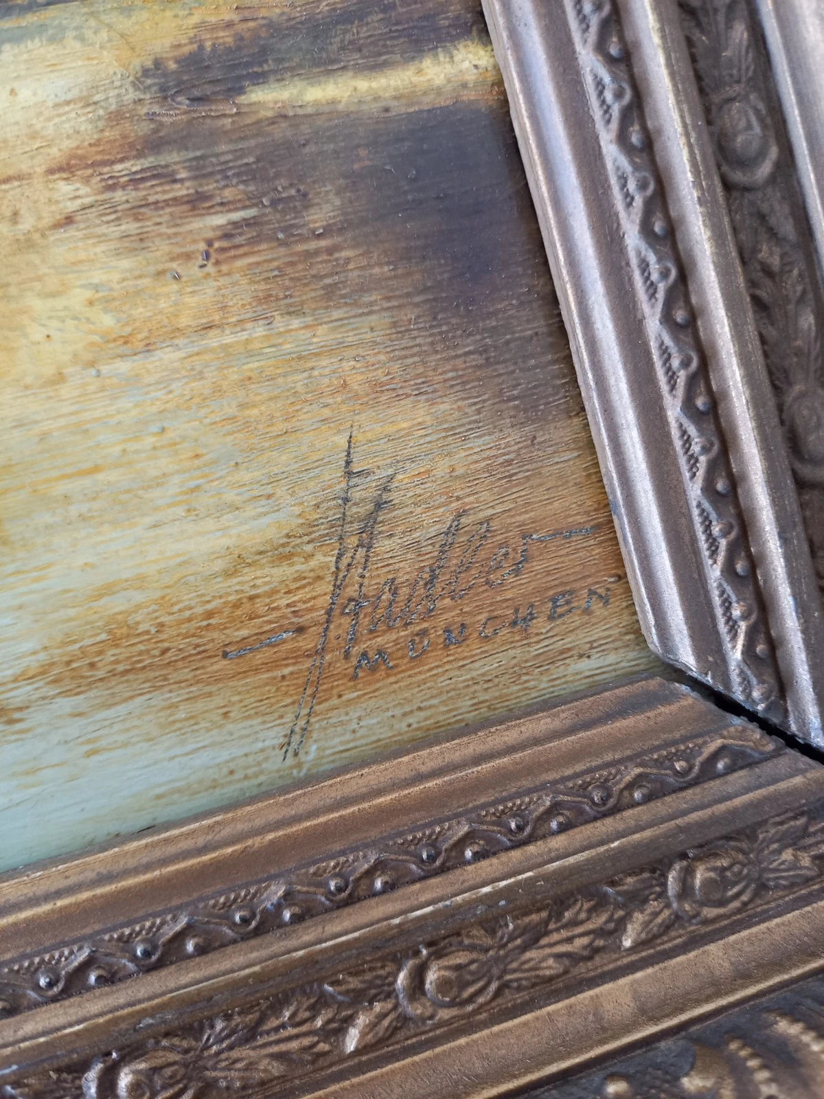 ORIGINAL Ölgemälde auf Holzplatte inkl. Rahmen, Motiv: Romantische Alpenlandschaft, Signiert unten rechts: Stadler / München, Größen: ca. 30x38 cm (mit Rahmen) / ca. 17x24,5 cm (ohne Rahmen, sichtbarer Teil des Gemäldes), Zustand dem Alter entsprechend (Gebrauchsspuren + Abplatzer am Rahmen -> siehe Fotos) - aus tierfreiem Nichtraucherhaushalt! Fotos sind Bestandteil des Angebots!