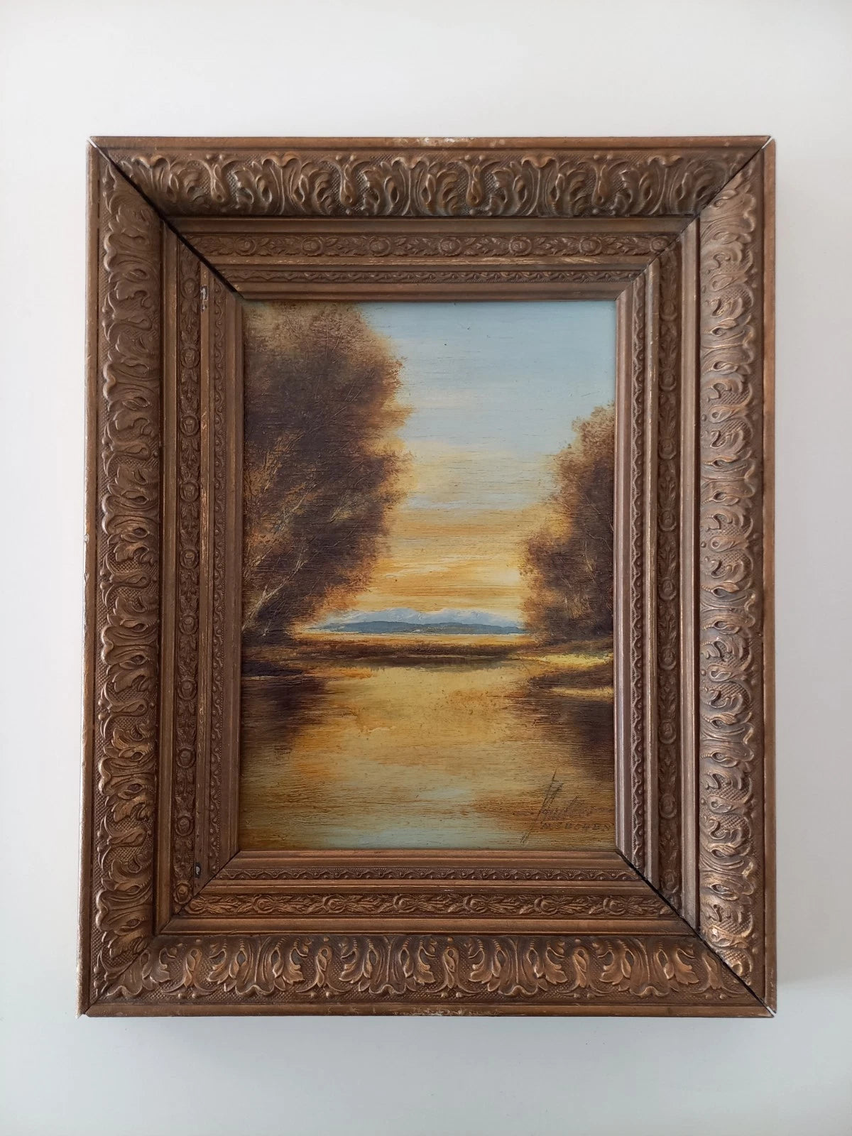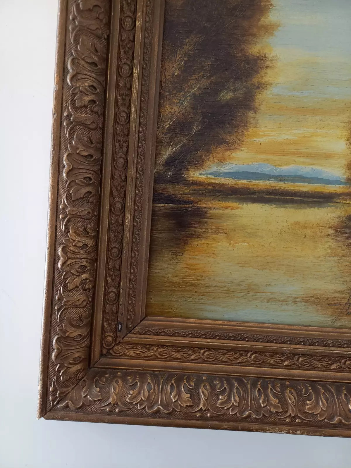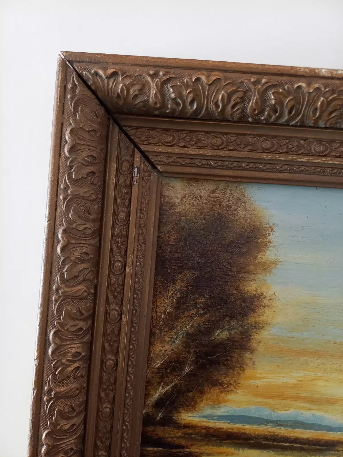 ORIGINAL Ölgemälde auf Holzplatte inkl. Rahmen, Motiv: Romantische Alpenlandschaft, Signiert unten rechts: Stadler / München, Größen: ca. 30x38 cm (mit Rahmen) / ca. 17x24,5 cm (ohne Rahmen, sichtbarer Teil des Gemäldes), Zustand dem Alter entsprechend (Gebrauchsspuren + Abplatzer am Rahmen -> siehe Fotos) - aus tierfreiem Nichtraucherhaushalt! Fotos sind Bestandteil des Angebots!
