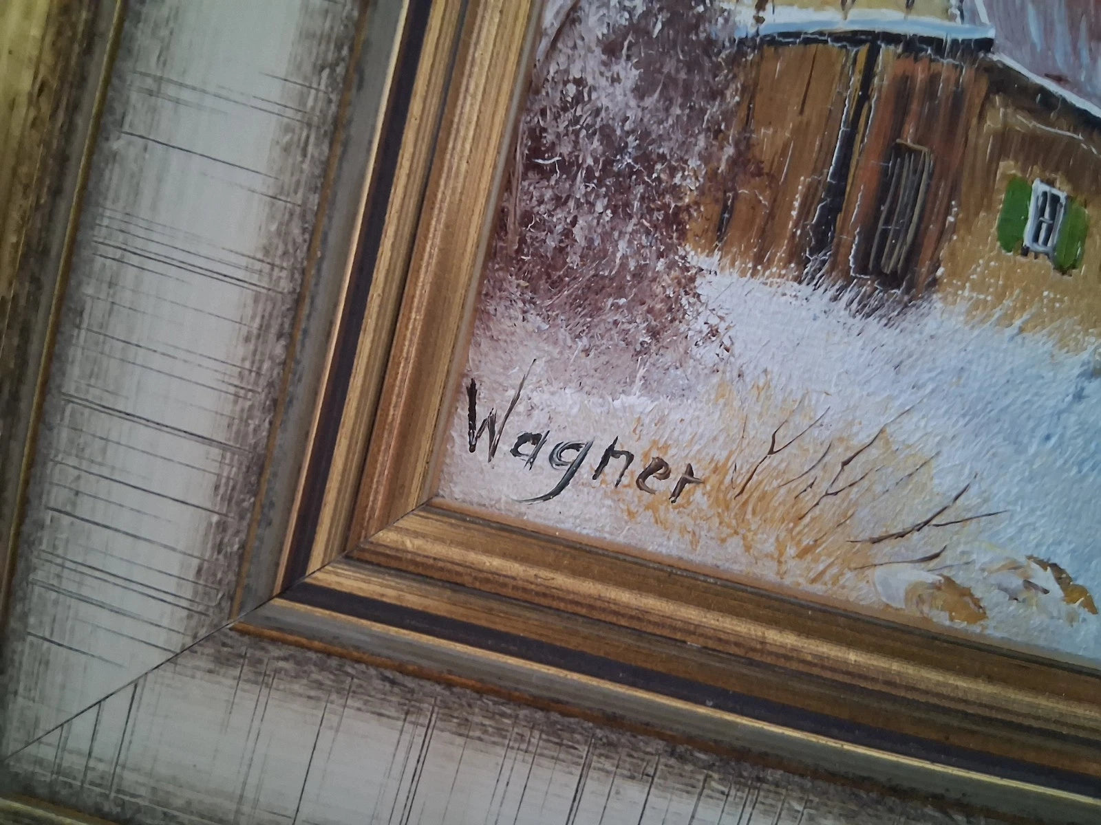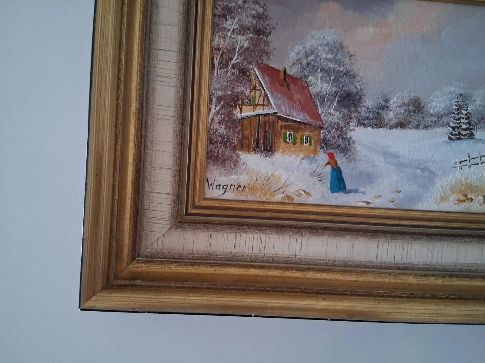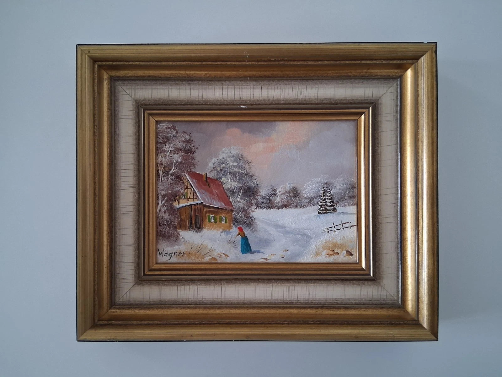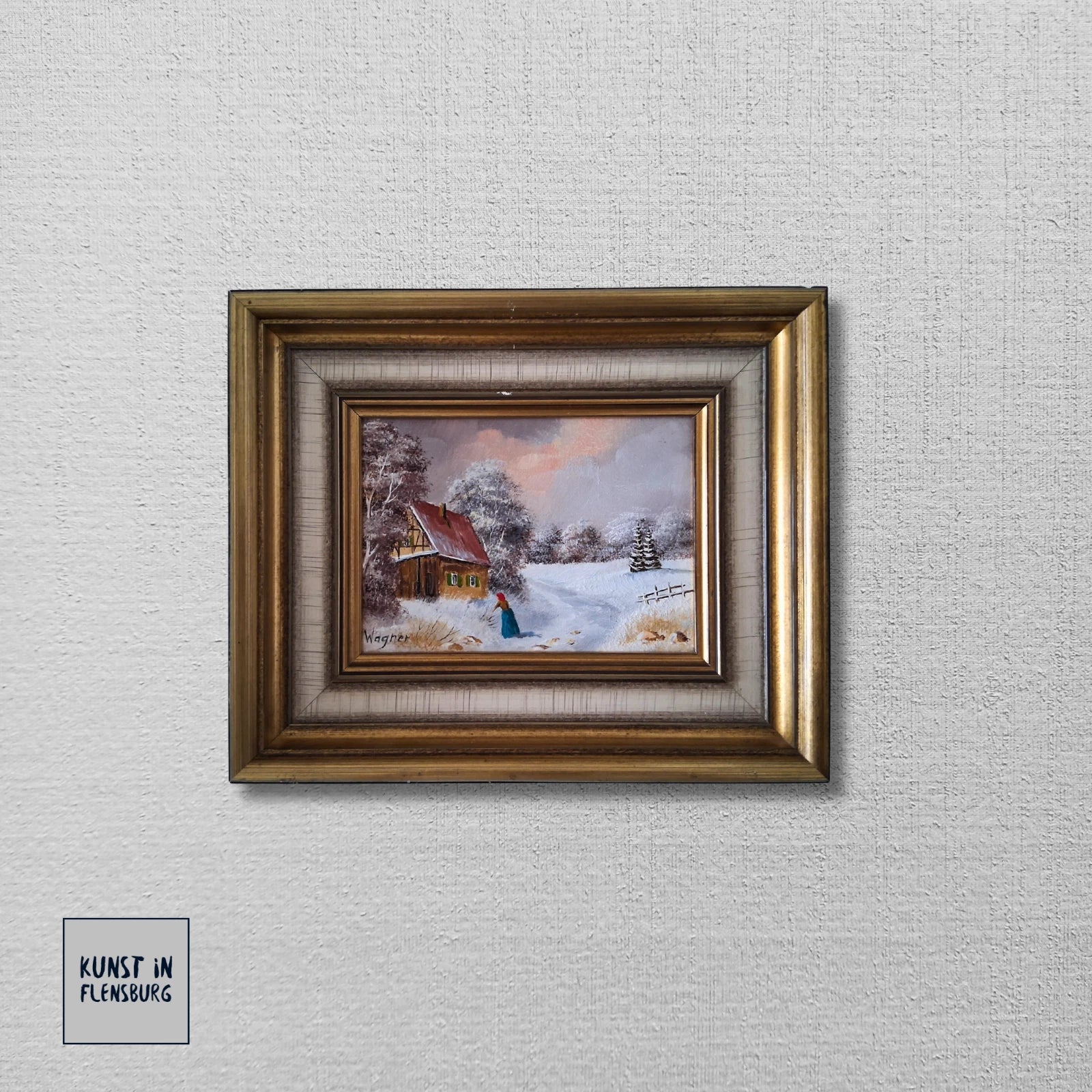 ORIGINAL Ölgemälde auf Karton inkl. Holzrahmen, Motiv: Bauernhaus/Winterlandschaft mit Figur, Signiert unten links: Wagner, Größen: ca. 28x23 cm (mit Rahmen), ca. 17x11,5 cm (ohne Rahmen, sichtbarer Teil des Gemäldes), Zustand dem Alter entsprechend (Gebrauchsspuren am Rahmen -> siehe Fotos) - aus tierfreiem Nichtraucherhaushalt! Fotos sind Bestandteil des Angebots!