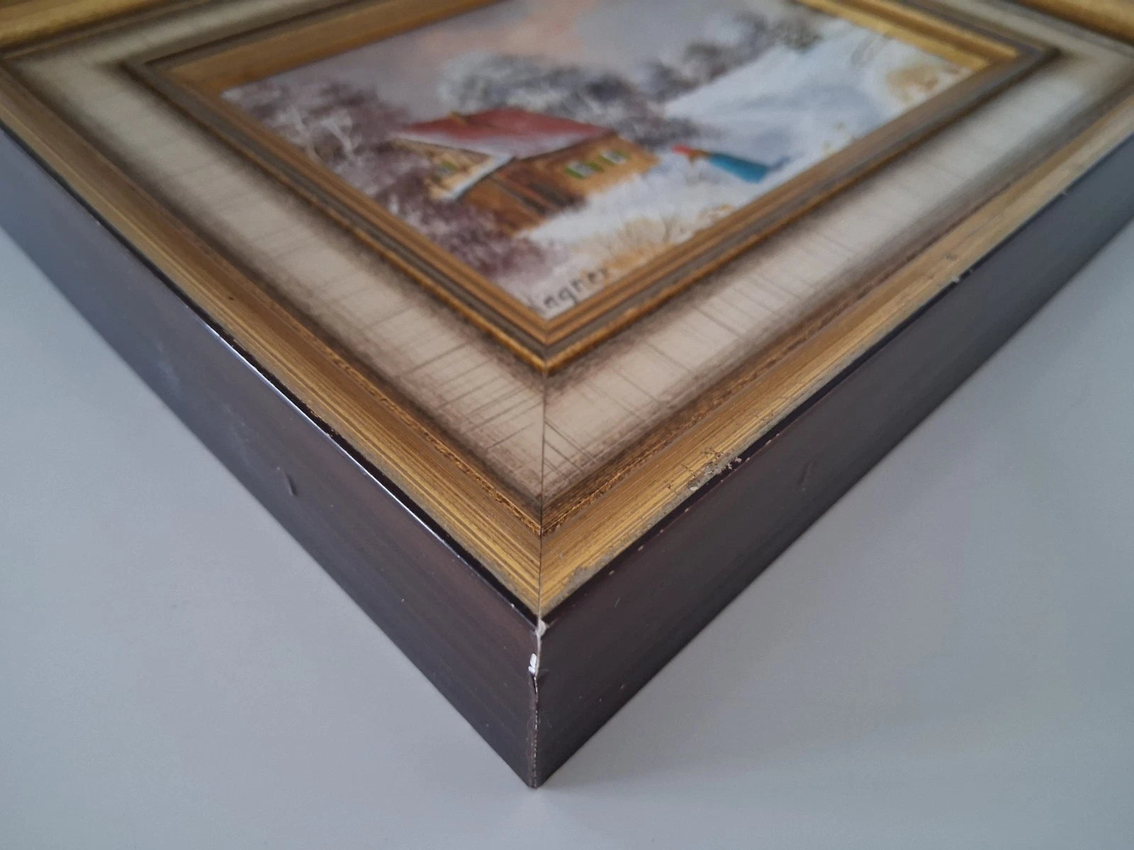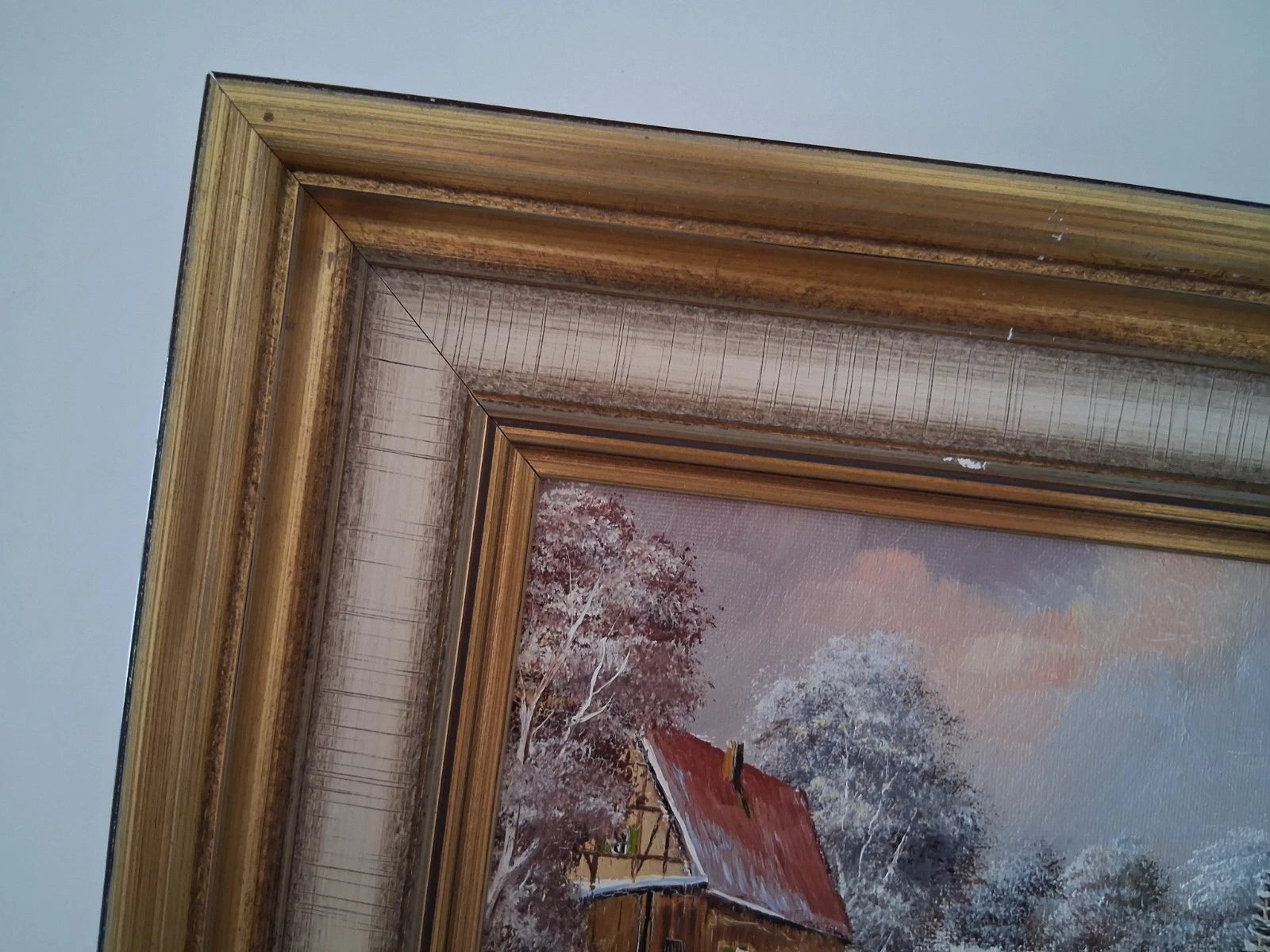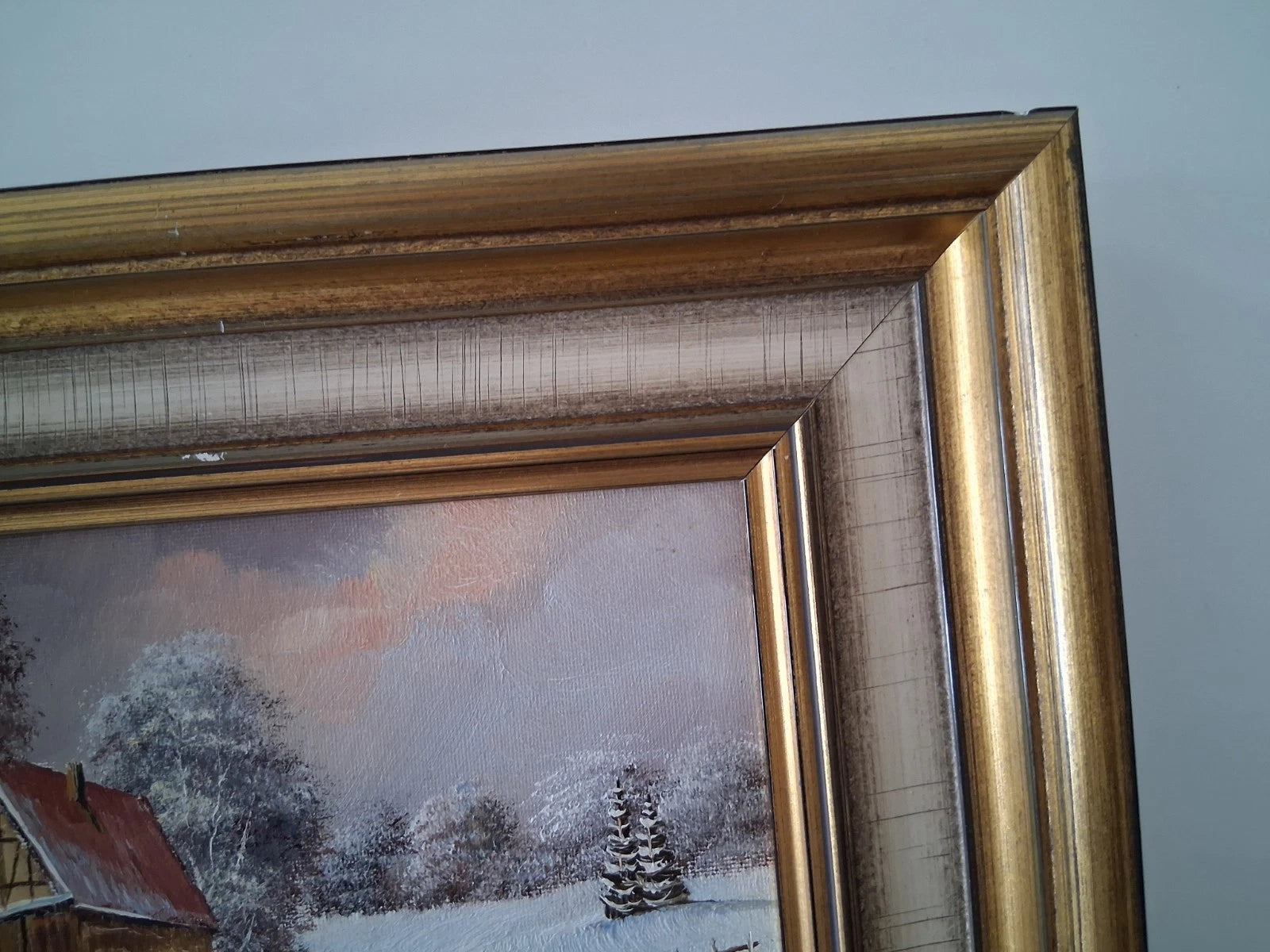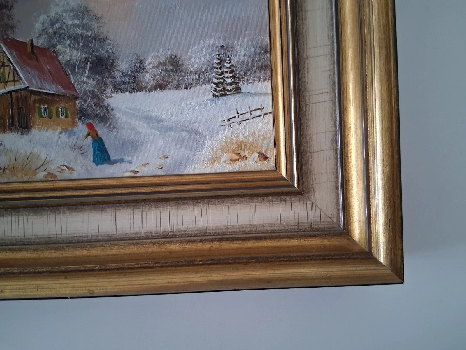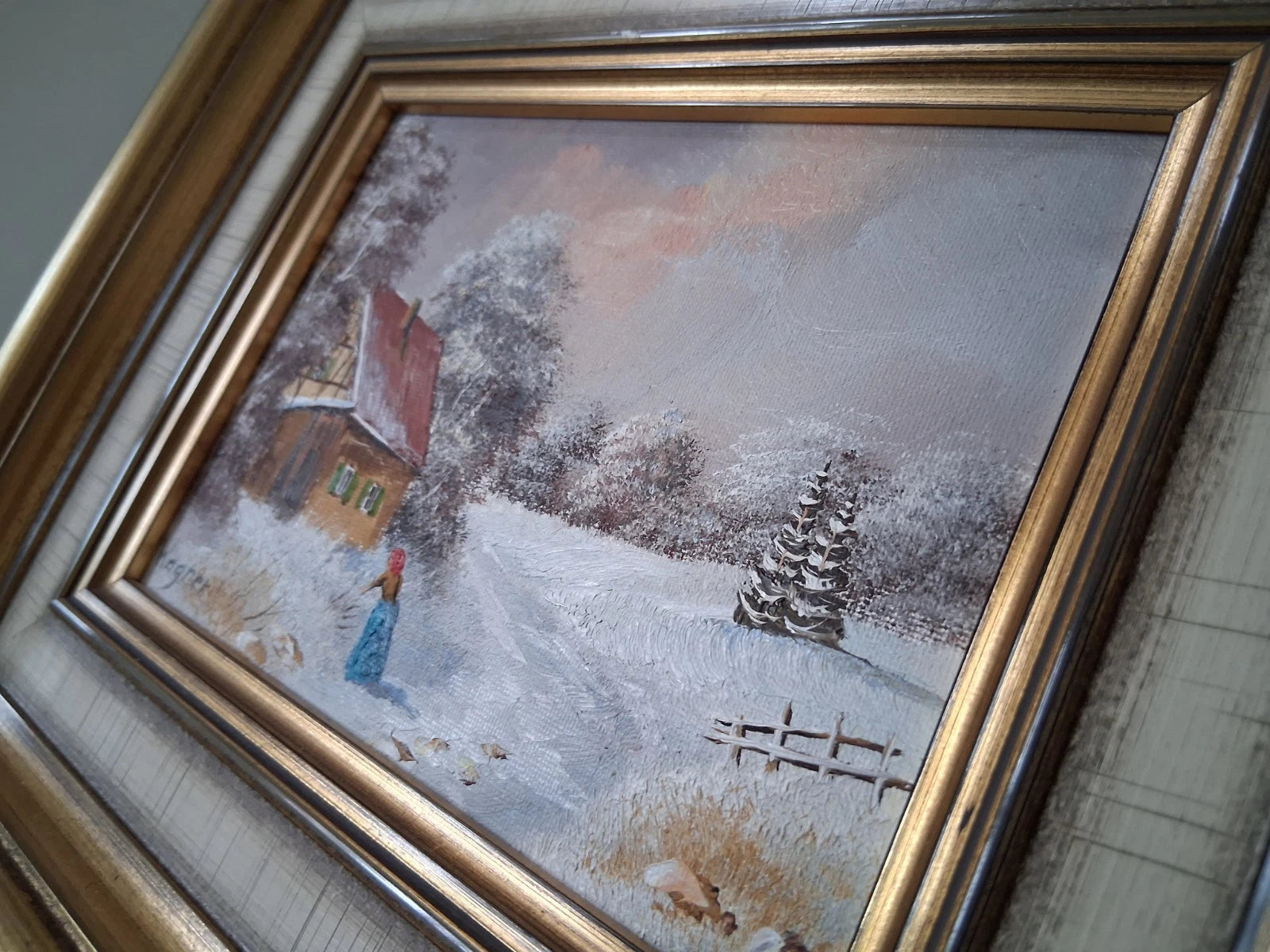 ORIGINAL Ölgemälde auf Karton inkl. Rahmen | Bauernhaus / Winterlandschaft mit Figur | Signiert