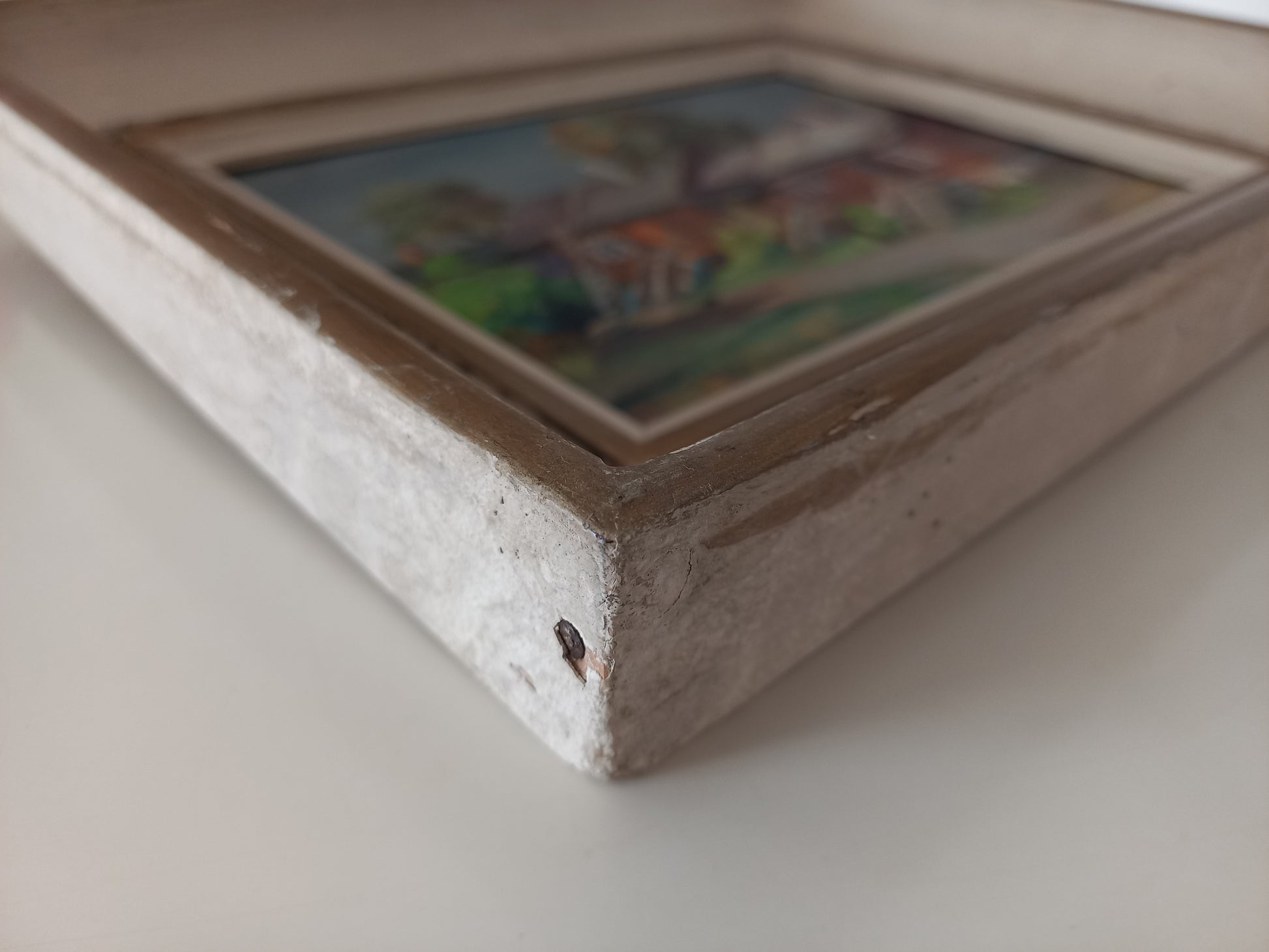 ORIGINAL Ölgemälde auf Karton inkl. Holzrahmen, Motiv: Landschaft/Bauernhaus mit Figur, Signiert unten links: (unleserlich), Größen: ca. 35x28,5 cm (mit Rahmen), ca. 23x17 cm (ohne Rahmen, sichtbarer Teil des Gemäldes), Zustand dem Alter entsprechend (Gebrauchsspuren am Rahmen -> siehe Fotos) - aus tierfreiem Nichtraucherhaushalt! Fotos sind Bestandteil des Angebots!
