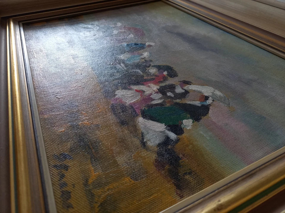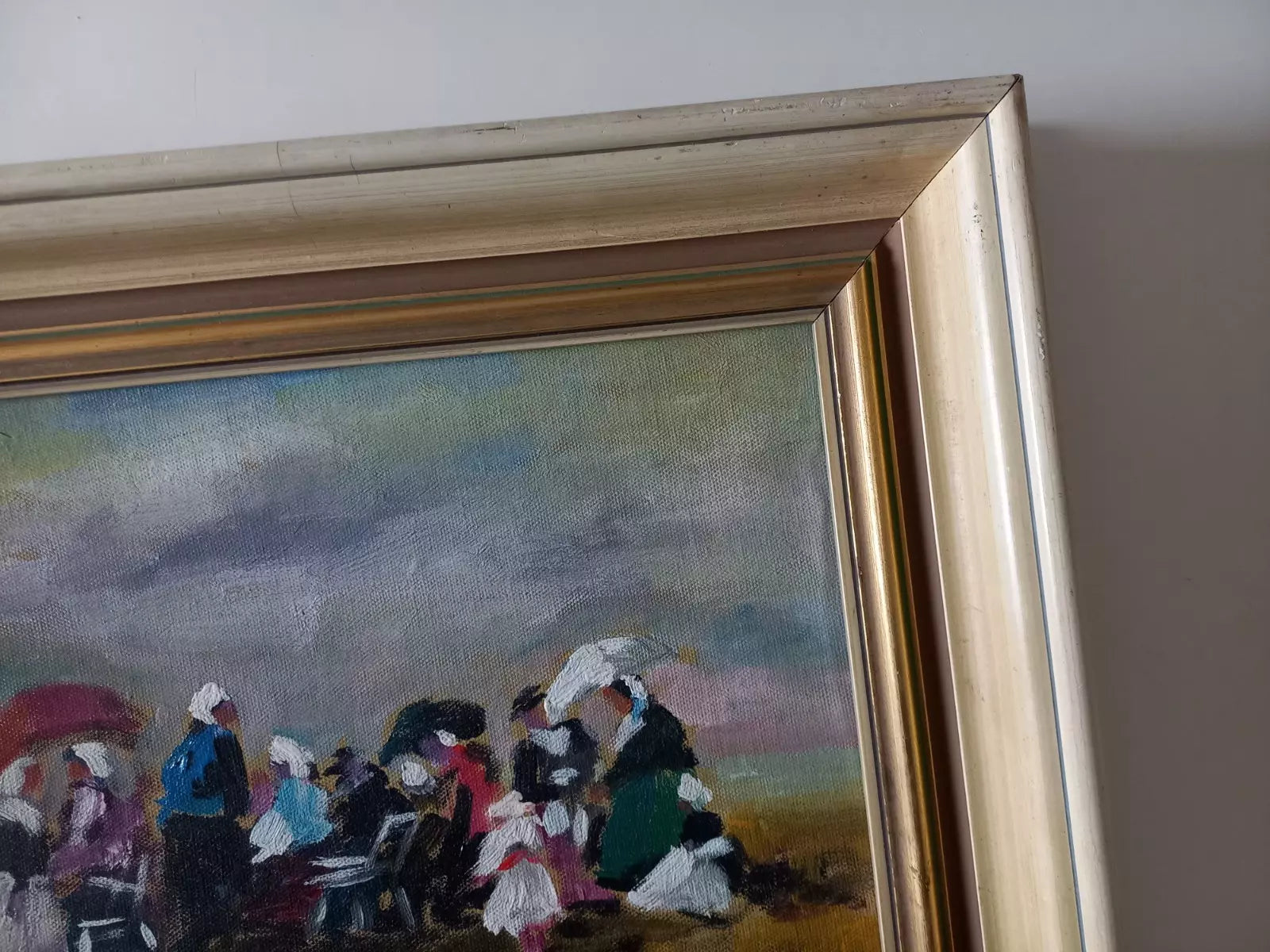 ORIGINAL Ölgemälde auf Karton inkl. Rahmen | Picknick am Strand / Abstrakt / Figuren | Signiert