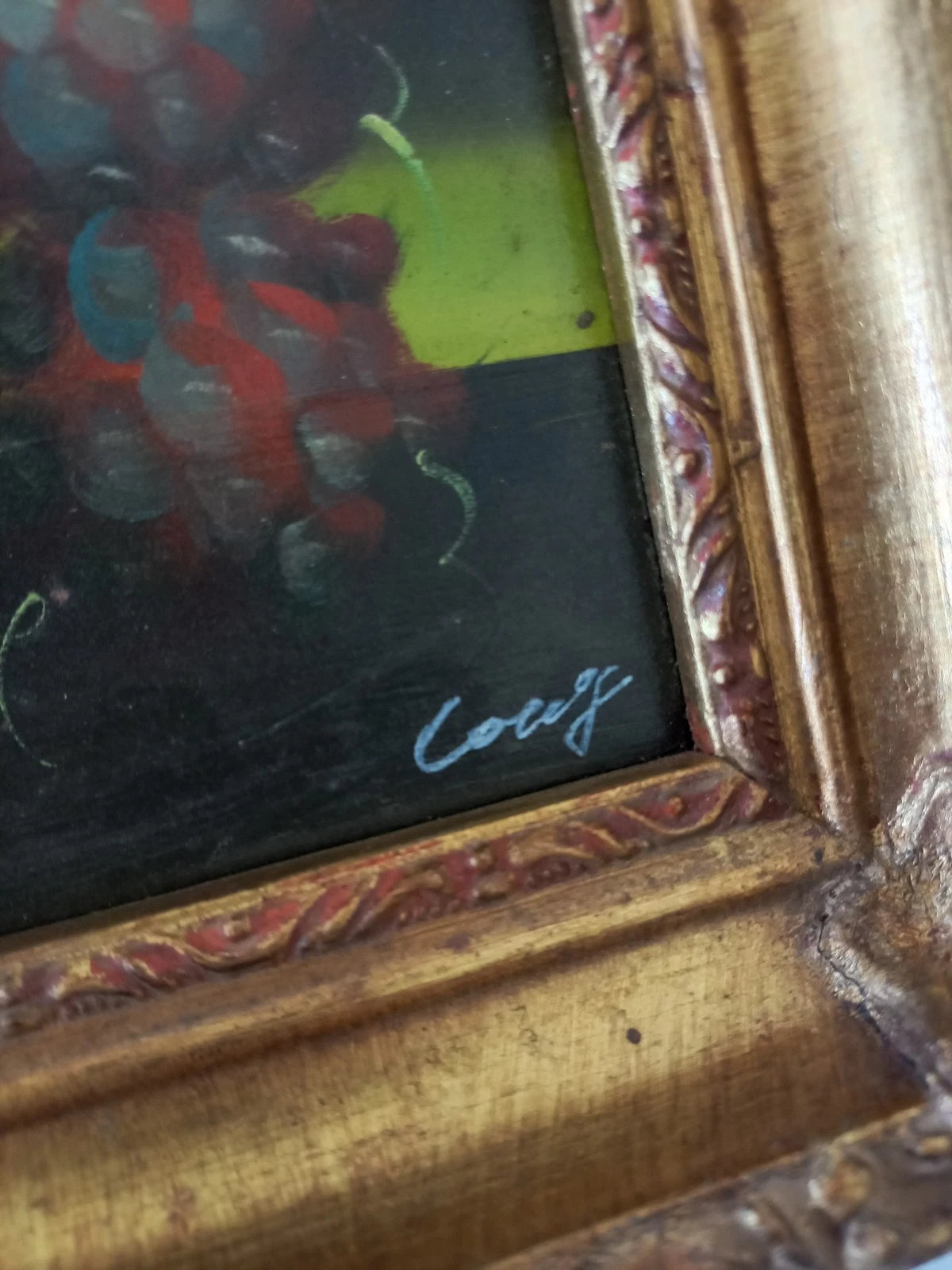 ORIGINAL Ölgemälde auf Karton inkl. antikem Holzrahmen, Motiv: Stillleben/Obst/Weintrauben, Signiert unten rechts: (unleserlich), Größen: ca. 21x26 cm (mit Rahmen) / ca. 11,5x16,5 cm (ohne Rahmen, sichtbarer Teil des Gemäldes), Zustand dem Alter entsprechend (Gebrauchsspuren am Rahmen -> siehe Fotos) - aus tierfreiem Nichtraucherhaushalt! Fotos sind Bestandteil des Angebots!