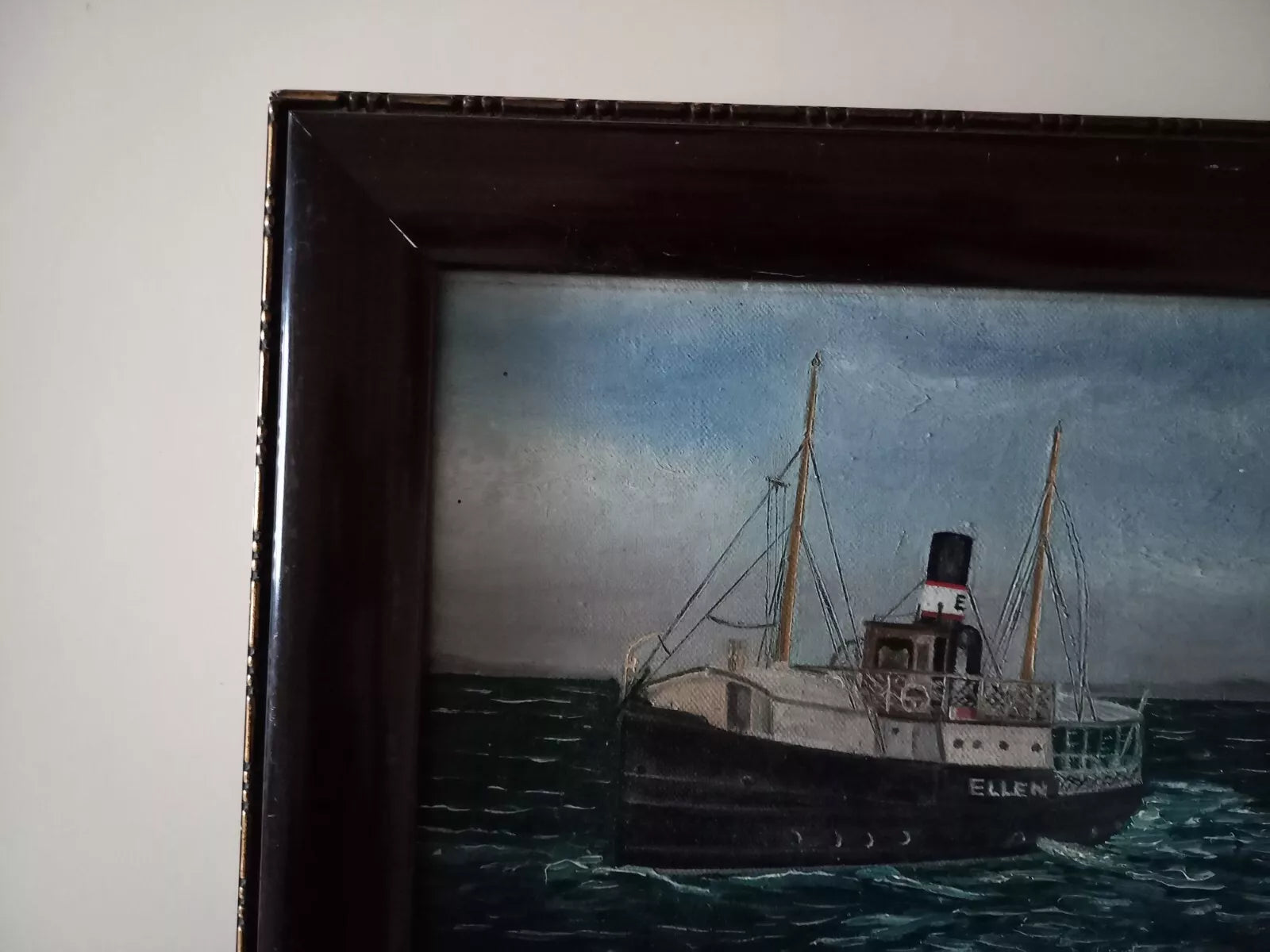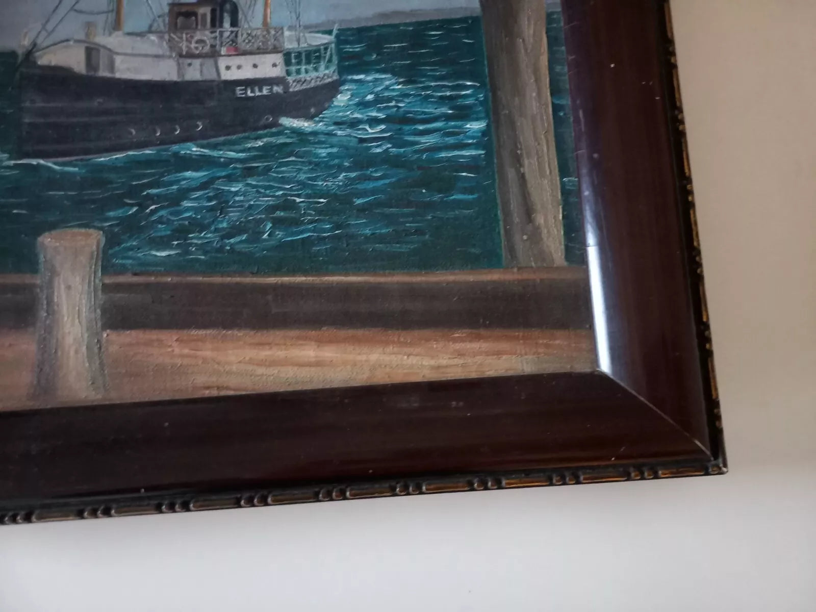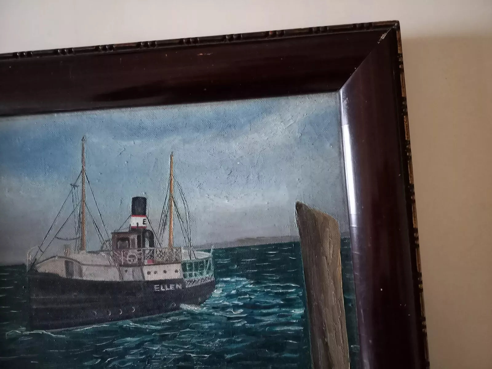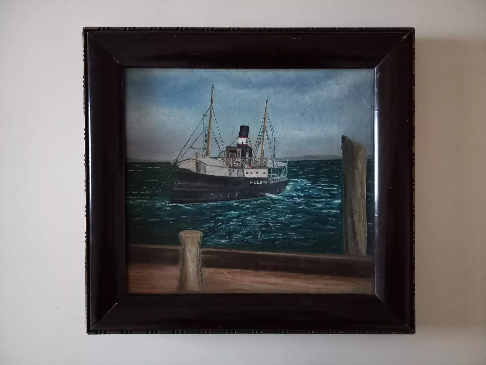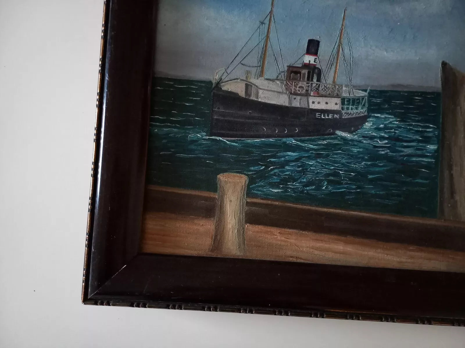 ORIGINAL Ölgemälde auf Leinwand inkl. Holzrahmen, Motiv: Dampfschiff "Ellen" beim Anlegen, Ohne Signatur, Größen: ca. 35,5x32,5 cm (mit Rahmen), ca. 27x24 cm (ohne Rahmen, sichtbarer Teil des Gemäldes), Zustand siehe Fotos (Gebrauchsspuren am Rahmen) - aus tierfreiem Nichtraucherhaushalt! Fotos sind Bestandteil des Angebots!