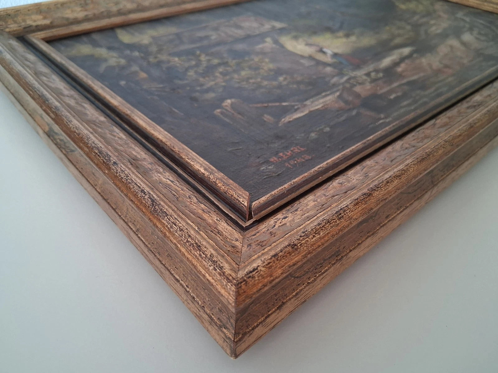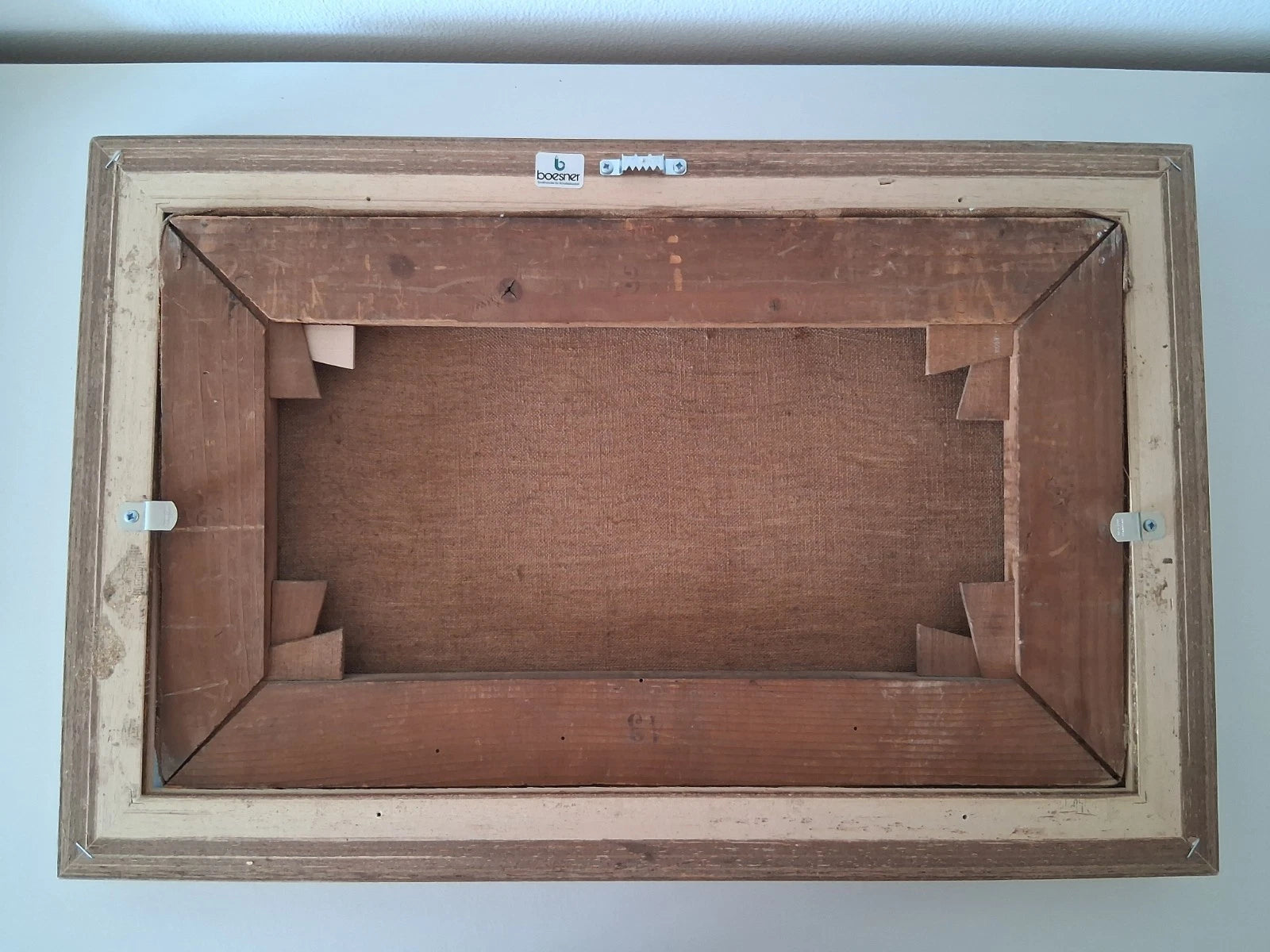 Zwei Leisten vom Innenteil des Rahmens sind lose, eine dritte sehr locker (siehe Fotos). Man könnte diese Leisten aber sicher nochmal neu befestigen bzw. kleben, da der Rahmen sehr schön zum Gemälde passt und sich sonst auch in einem guten Zustand befindet. Das Gemälde müsste ggf. auch nochmal neu befestigt werden, es sitzt etwas locker!